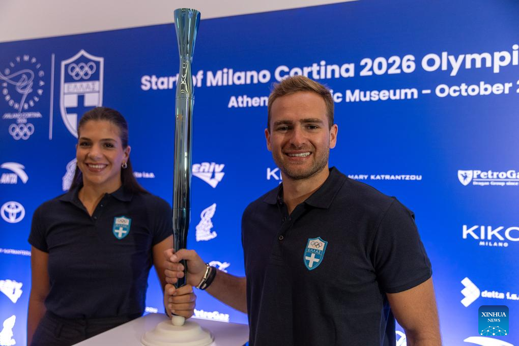First torchbearer Alexandros Ginnis (R) and last torchbearer Eleni Xenaki hold the torch during a press conference on the preparations for the Olympic flame lighting and handover ceremonies, in Athens, Greece, Oct. 16, 2025. Greek water polo athlete Eleni Xenaki will be the last torchbearer on Greek soil for the 2026 Milano-Cortina winter Olympic Games, the Hellenic Olympic Committee (HOC) said during the press conference held in Athens on Thursday. Greek alpine skier Alexandros Ginnis will start the torch relay at the end of the Olympic flame lighting ceremony which will be held on Nov. 26 at ancient Olympia, in western Greece, the birthplace of the Olympic Games. (Photo by Marios Lolos/Xinhua)