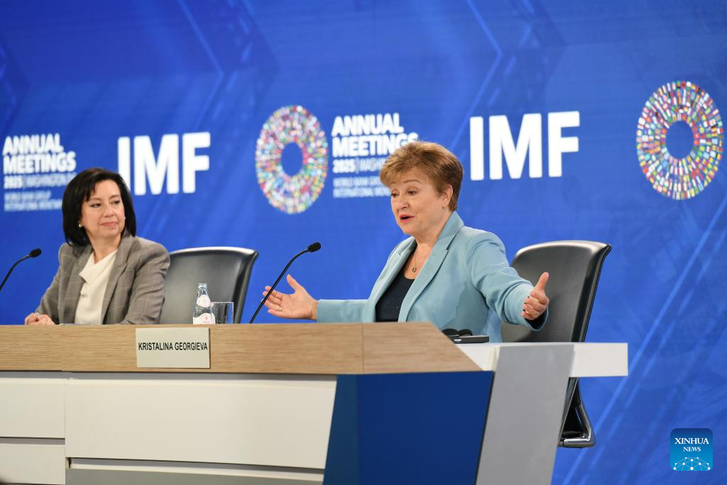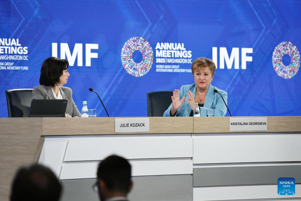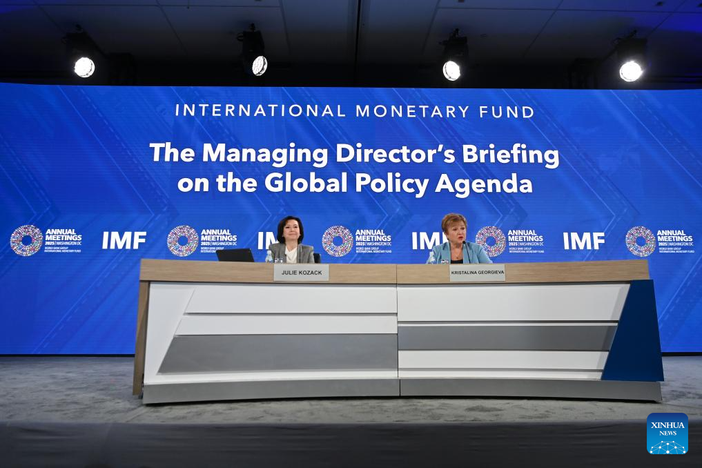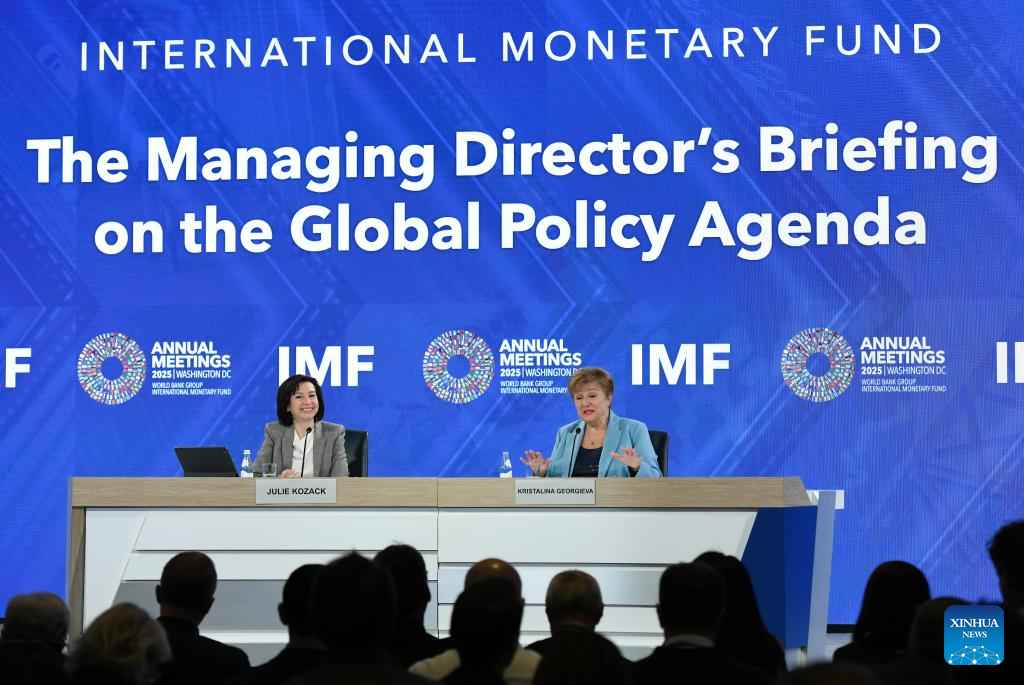 International Monetary Fund (IMF) Managing Director Kristalina Georgieva (R) speaks at the managing director's briefing on the Global Policy Agenda in Washington, D.C., the United States, Oct. 16, 2025. (Xinhua/Li Rui)
