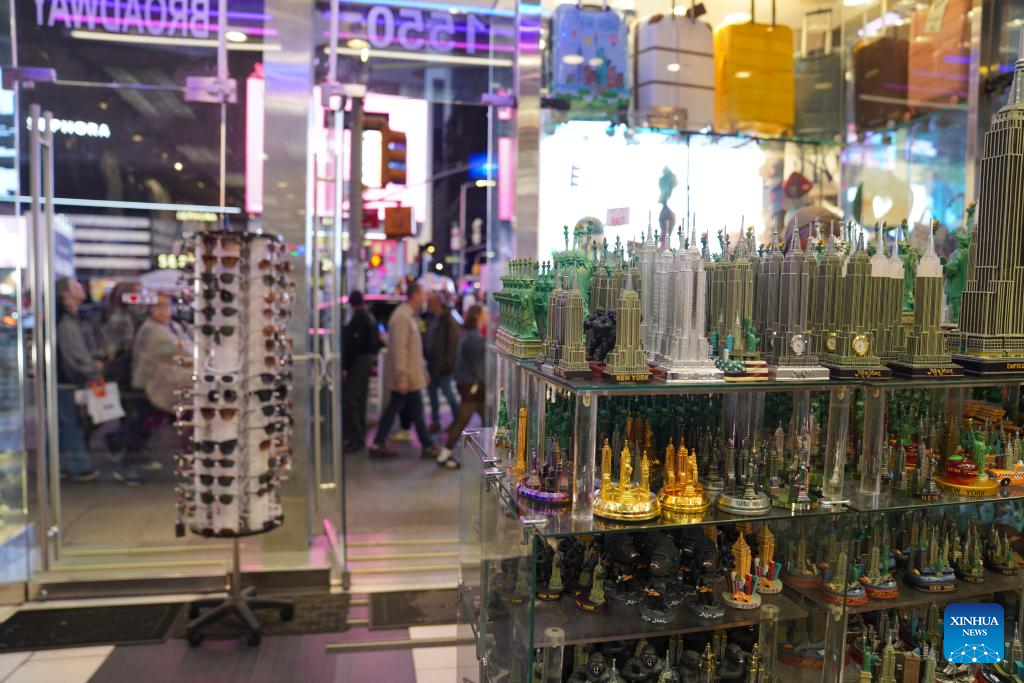 People walk past a souvenir shop in New York, the United States, on Oct. 16, 2025. Due to federal government shutdown, the scheduled Thursday release of U.S. retail sales and PPI data has been delayed. (Xinhua/Zhang Fengguo)