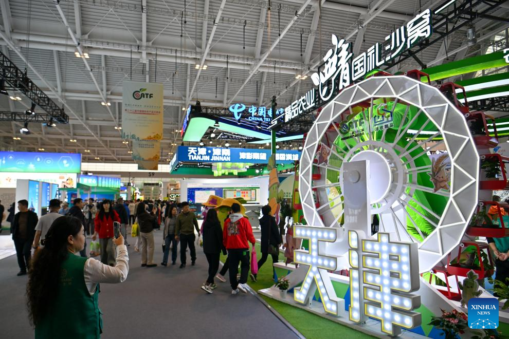 People visit the 22nd China International Agricultural Trade Fair in north China's Tianjin Municipality, Oct. 17, 2025. The agricultural trade fair was launched Friday in Tianjin, and will last until Oct. 19. With 12 exhibition areas, the fair saw about 25,000 types of agricultural products on display, brought by over 3,000 exhibitors. (Xinhua/Sun Fanyue)