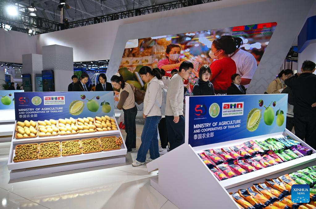 People visit the booth of Thailand during the 22nd China International Agricultural Trade Fair in north China's Tianjin Municipality, Oct. 17, 2025. The agricultural trade fair was launched Friday in Tianjin, and will last until Oct. 19. With 12 exhibition areas, the fair saw about 25,000 types of agricultural products on display, brought by over 3,000 exhibitors. (Xinhua/Sun Fanyue)