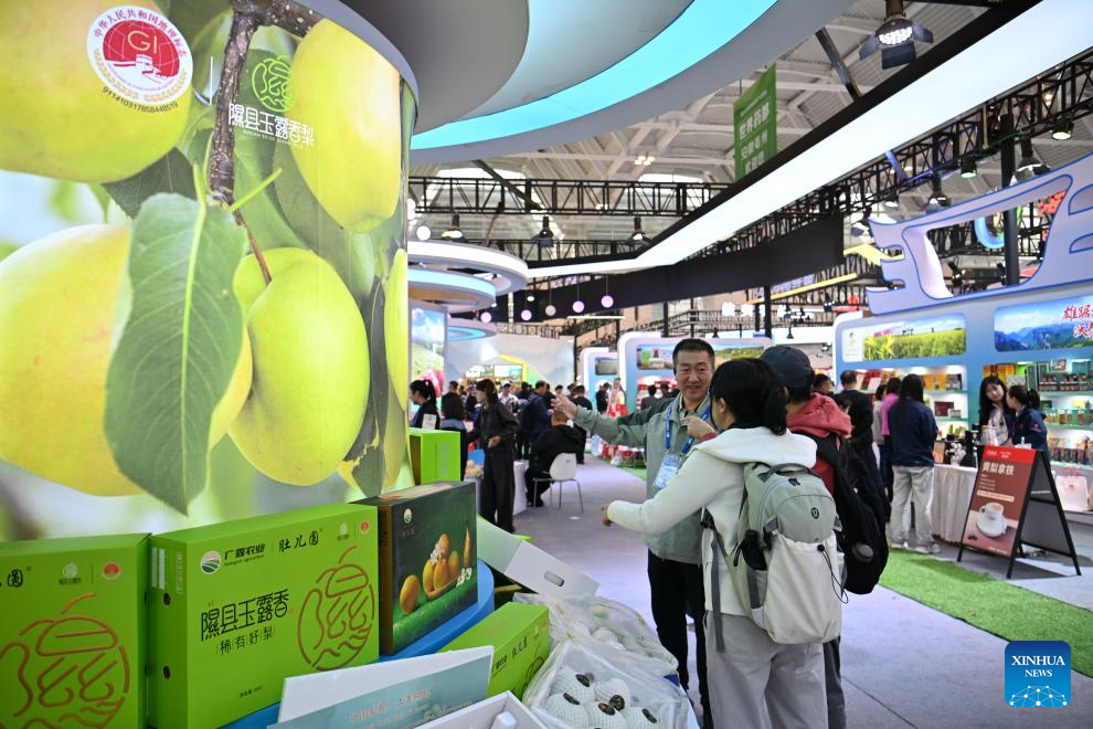 People select products during the 22nd China International Agricultural Trade Fair in north China's Tianjin Municipality, Oct. 17, 2025. The agricultural trade fair was launched Friday in Tianjin, and will last until Oct. 19. With 12 exhibition areas, the fair saw about 25,000 types of agricultural products on display, brought by over 3,000 exhibitors. (Xinhua/Sun Fanyue)
