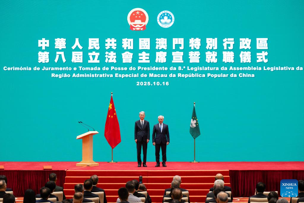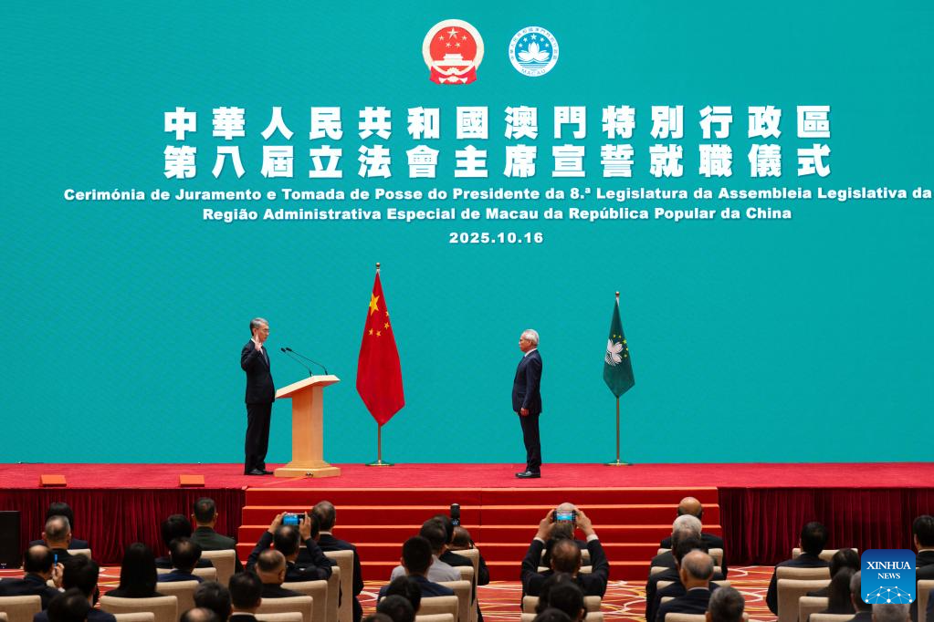 MACAO, Oct. 16 (Xinhua) -- All members of the eighth Legislative Assembly of the Macao Special Administrative Region (SAR) were sworn in on Thursday, and Cheong Weng Chon was elected as the legislature's president.