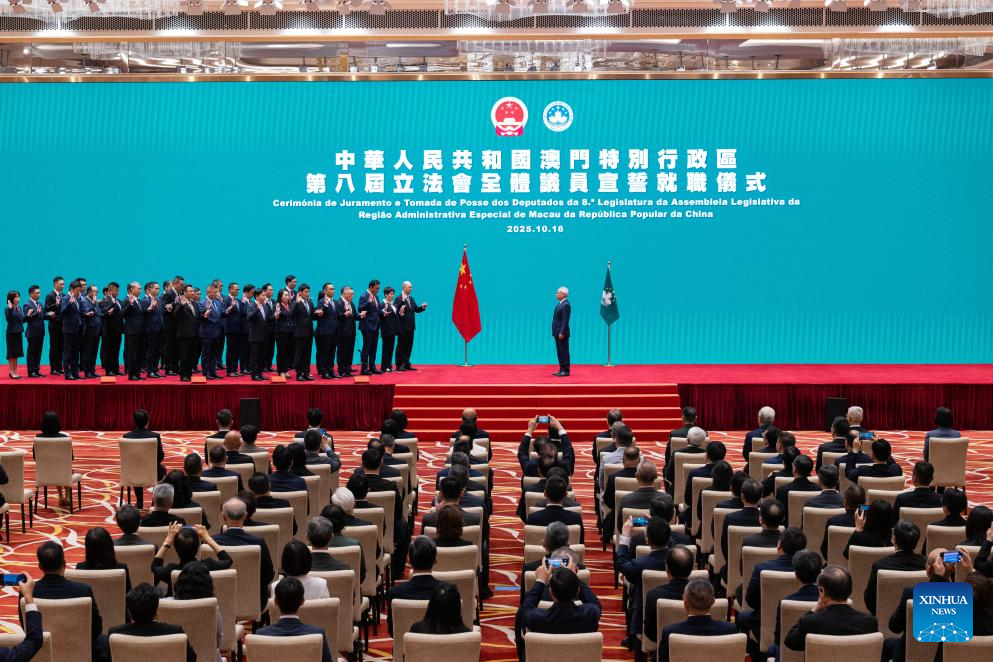 Members of the eighth Legislative Assembly of the Macao Special Administrative Region (SAR) are sworn in during a ceremony administered by Macao SAR Chief Executive Sam Hou Fai (1st R), in south China's Macao, Oct. 16, 2025. (Xinhua/Cheong Kam Ka)