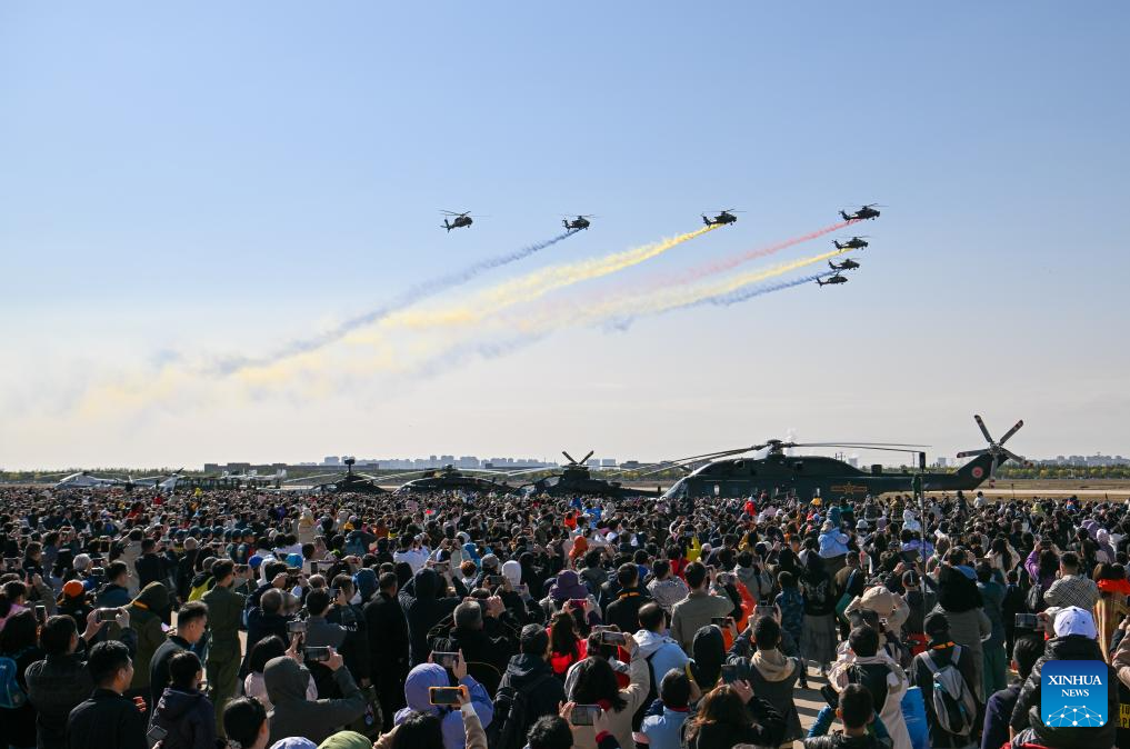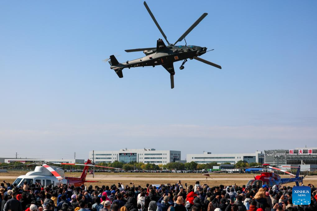 People watch as a Z-10 helicopter finishes a performance during the 7th China Helicopter Exposition in north China's Tianjin Municipality, Oct. 18, 2025. The exposition opened to the general public on Saturday. (Xinhua/Sun Fanyue)