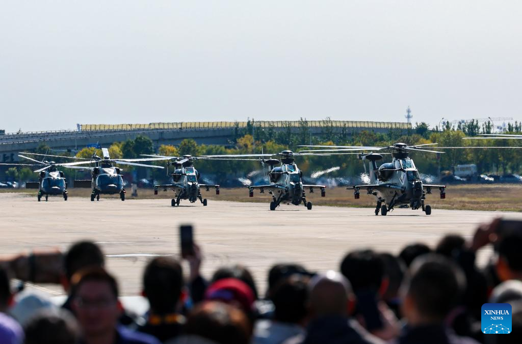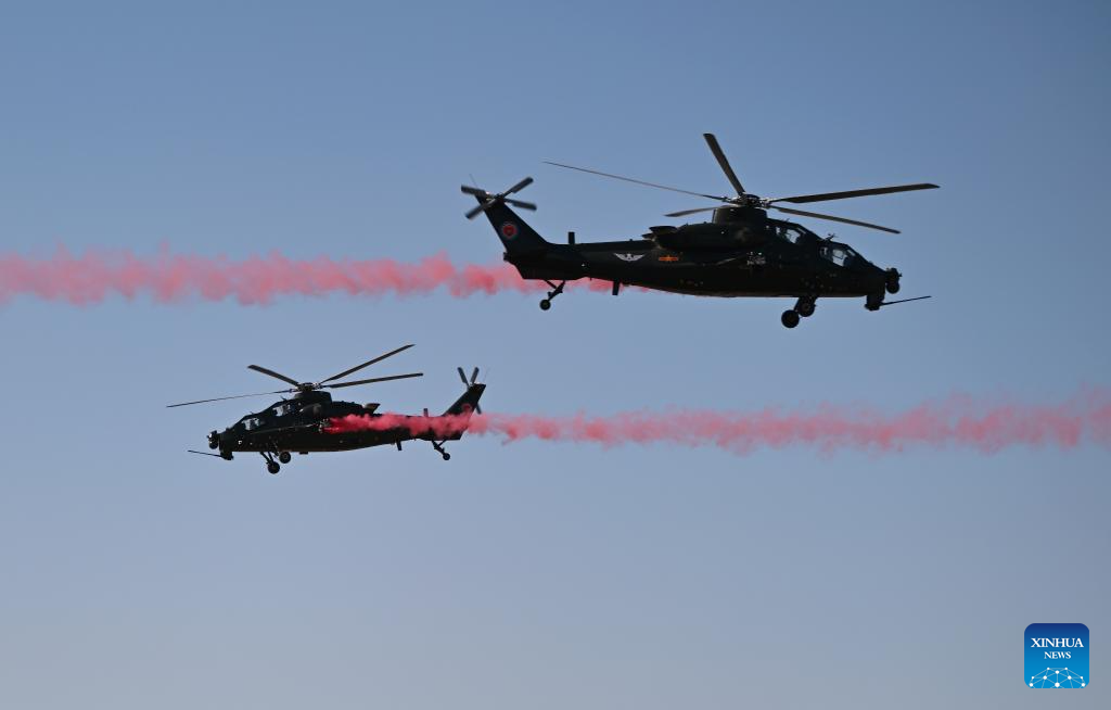 Z-10 helicopters perform during the 7th China Helicopter Exposition in north China's Tianjin Municipality, Oct. 18, 2025. The exposition opened to the general public on Saturday. (Xinhua/Li Ran)