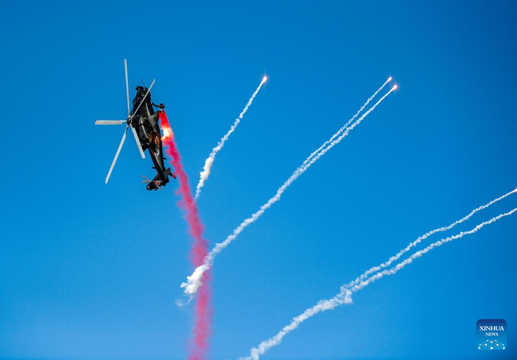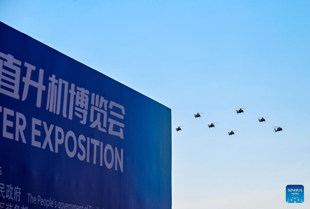 A Z-10 helicopter performs during the 7th China Helicopter Exposition in north China's Tianjin Municipality, Oct. 18, 2025. The exposition opened to the general public on Saturday. (Xinhua/Sun Fanyue)