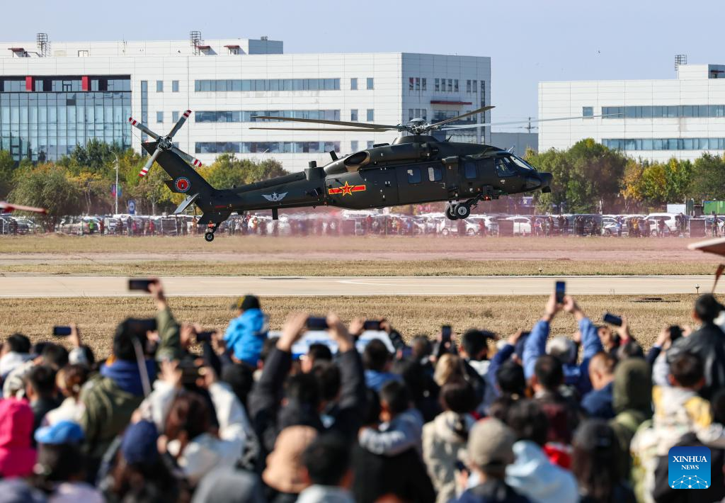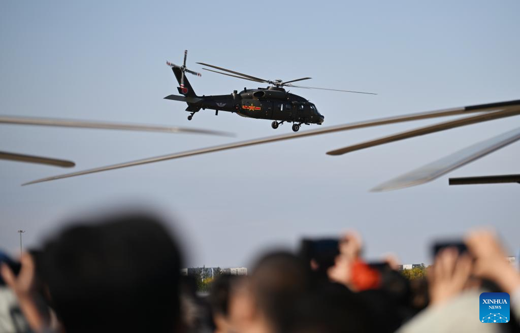 A Z-20 helicopter performs during the 7th China Helicopter Exposition in north China's Tianjin Municipality, Oct. 18, 2025. The exposition opened to the general public on Saturday. (Xinhua/Li Ran)