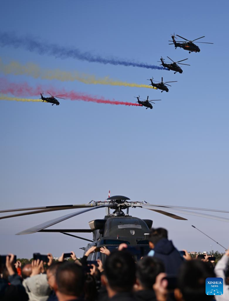 Helicopters of Fenglei aerobatic team of the Chinese People's Liberation Army (PLA) perform during the 7th China Helicopter Exposition in north China's Tianjin Municipality, Oct. 18, 2025. The exposition opens to the general public on Saturday. (Xinhua/Liu Fang)