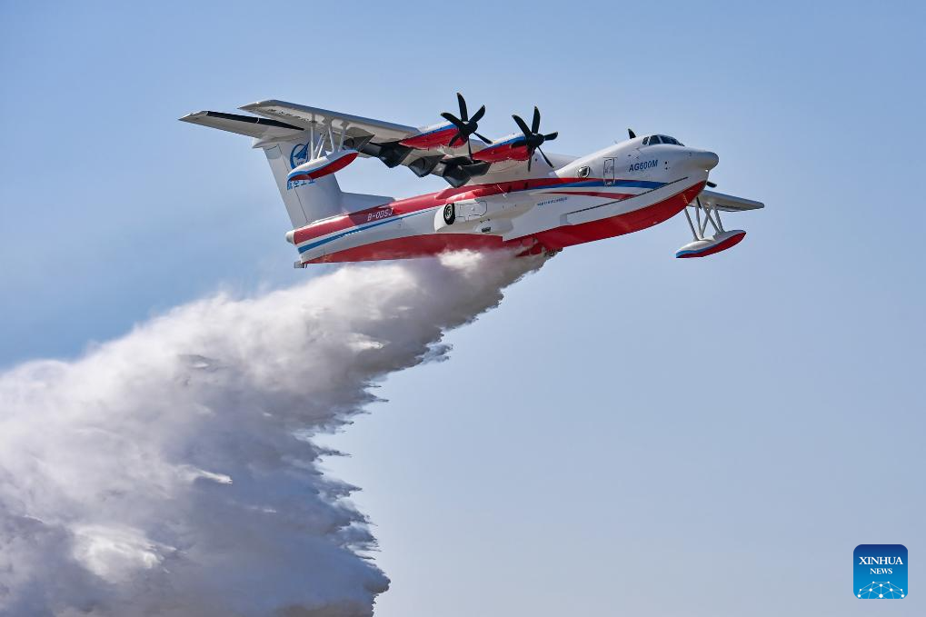 An AG600 amphibious aircraft performs during the 7th China Helicopter Exposition in Tianjin, north China, Oct. 18, 2025. The exposition opened to the general public on Saturday. (Photo by Du Penghui/Xinhua)