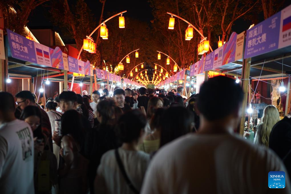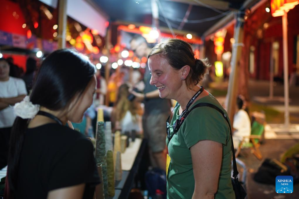 Artists chat at a ceramic carnival held as a sideline event of the 2025 China Jingdezhen International Ceramic Expo in Jingdezhen, east China's Jiangxi Province, Oct. 17, 2025. The 2025 China Jingdezhen International Ceramic Expo opened on Oct. 18 in Jingdezhen, an eastern Chinese city famed as the "porcelain capital," attracting more than 1,000 buyers from home and abroad. (Xinhua/Zhou Mi)