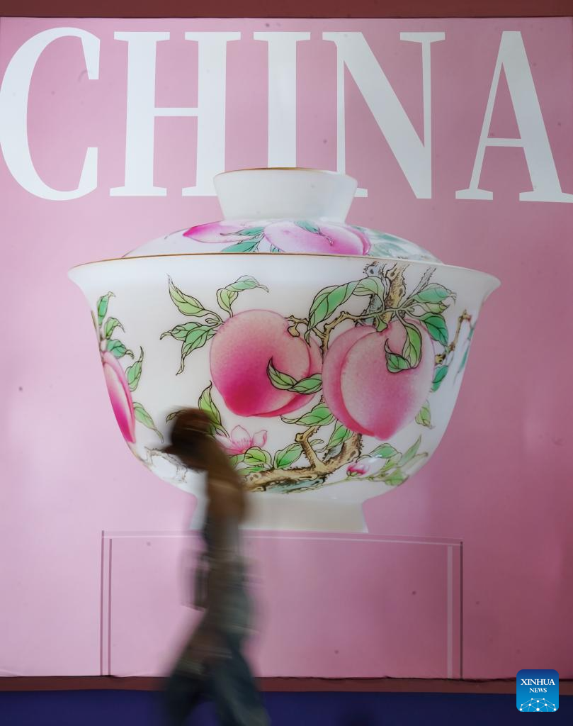 A visitor walks past a poster displaying a ceramic work during the 2025 China Jingdezhen International Ceramic Expo in Jingdezhen, east China's Jiangxi Province, Oct. 18, 2025. The 2025 China Jingdezhen International Ceramic Expo opened on Oct. 18 in Jingdezhen, an eastern Chinese city famed as the "porcelain capital," attracting more than 1,000 buyers from home and abroad. (Xinhua/Zhou Mi)
