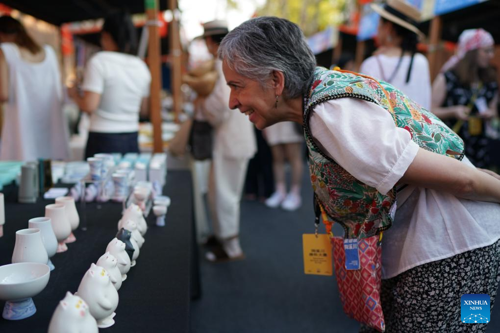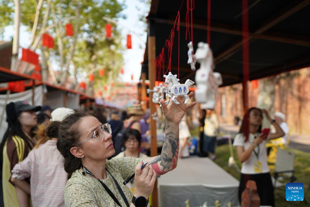 A foreign artist looks at ceramic works at a ceramic carnival held as a sideline event of the 2025 China Jingdezhen International Ceramic Expo in Jingdezhen, east China's Jiangxi Province, Oct. 17, 2025. The 2025 China Jingdezhen International Ceramic Expo opened on Oct. 18 in Jingdezhen, an eastern Chinese city famed as the "porcelain capital," attracting more than 1,000 buyers from home and abroad. (Xinhua/Zhou Mi)