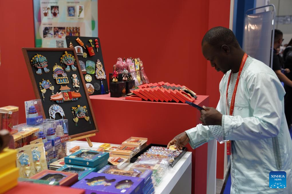 A foreign exhibitor selects cultural and creative products during the 2025 China Jingdezhen International Ceramic Expo in Jingdezhen, east China's Jiangxi Province, Oct. 18, 2025. The 2025 China Jingdezhen International Ceramic Expo opened on Saturday in Jingdezhen, an eastern Chinese city famed as the "porcelain capital," attracting more than 1,000 buyers from home and abroad. (Xinhua/Zhou Mi)