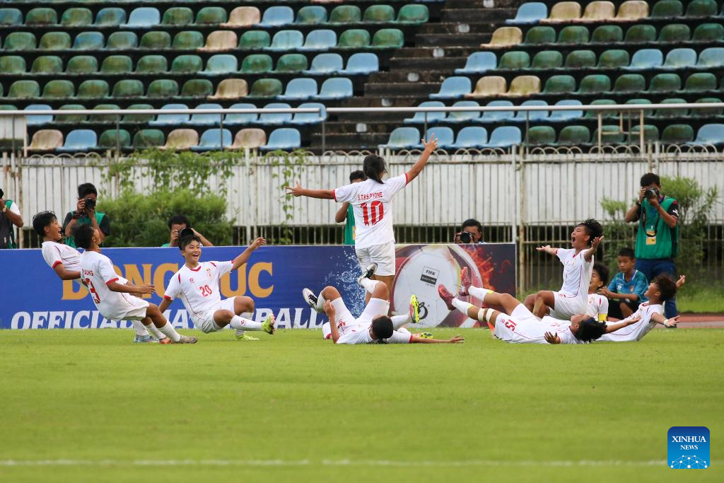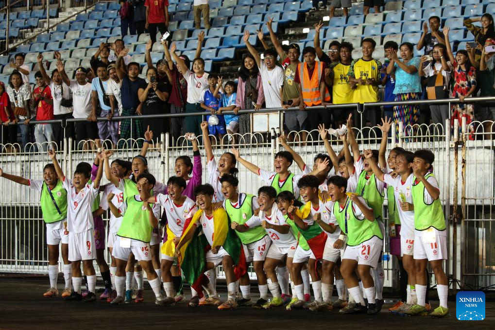 Players of Myanmar celebrate after the AFC U17 Women's Asian Cup China 2026 qualifier between Indonesia and Myanmar in Yangon, Myanmar, Oct. 17, 2025. (Xinhua/Myo Kyaw Soe)
