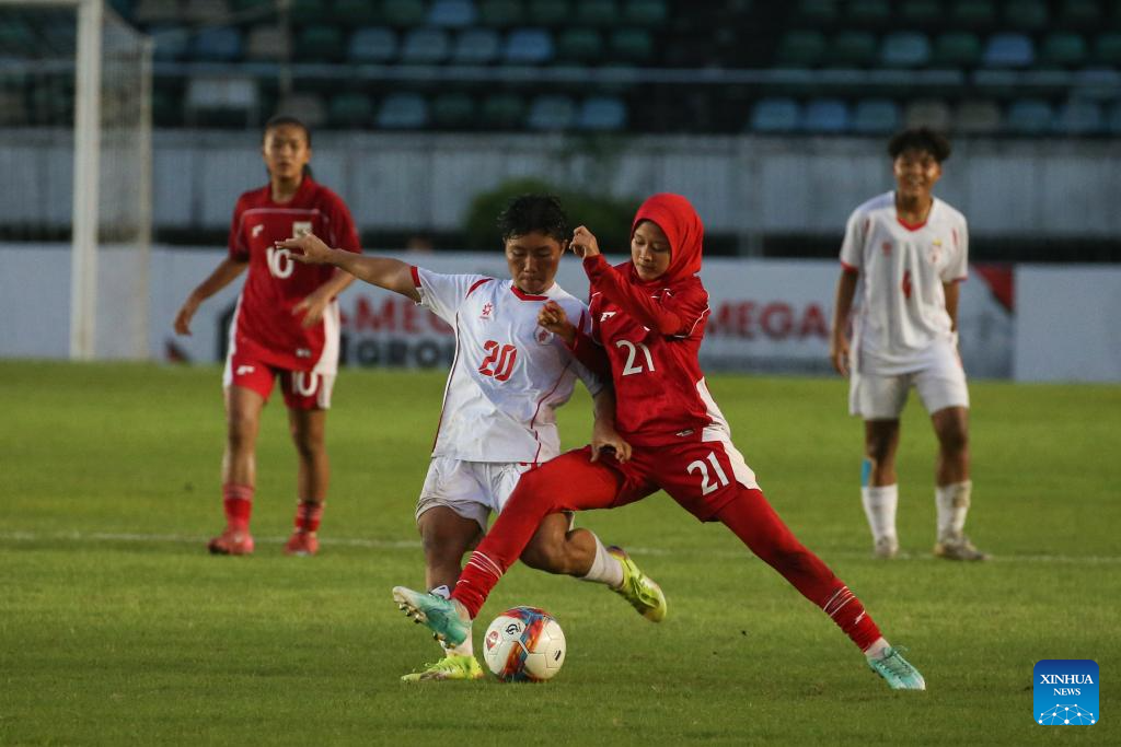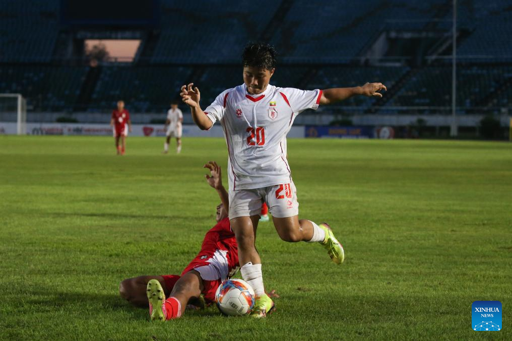 Khaing Zin Myint (R) of Myanmar competes during the AFC U17 Women's Asian Cup China 2026 qualifier between Indonesia and Myanmar in Yangon, Myanmar, Oct. 17, 2025. (Xinhua/Myo Kyaw Soe)