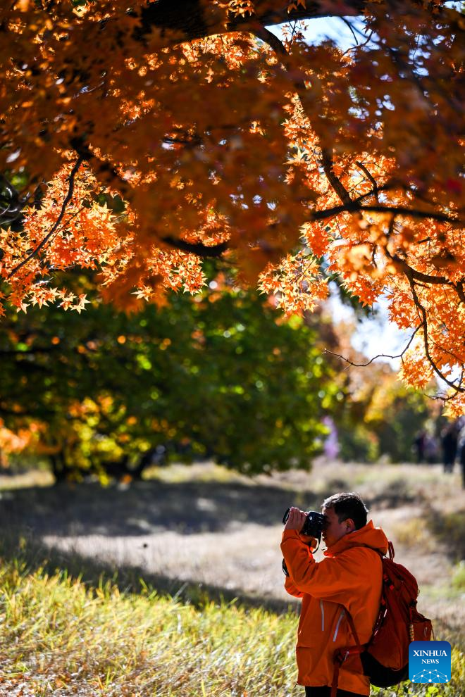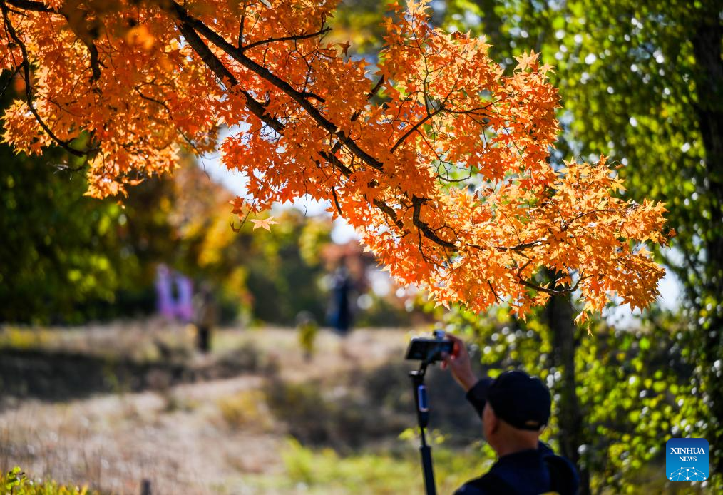 A tourist takes photos at a forest park in Horqin Left Wing Rear Banner of Tongliao City, north China's Inner Mongolia Autonomous Region, Oct. 18, 2025. (Xinhua/Lian Zhen)