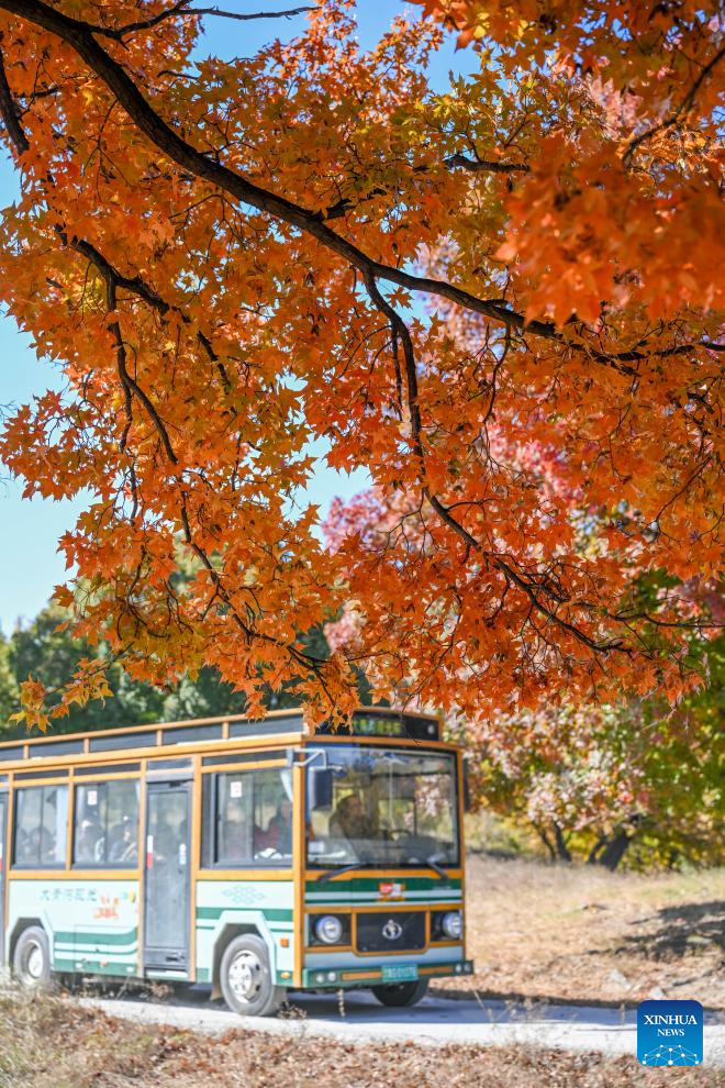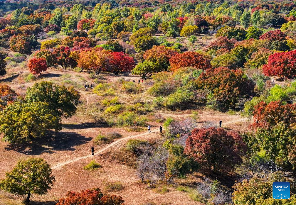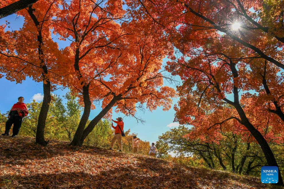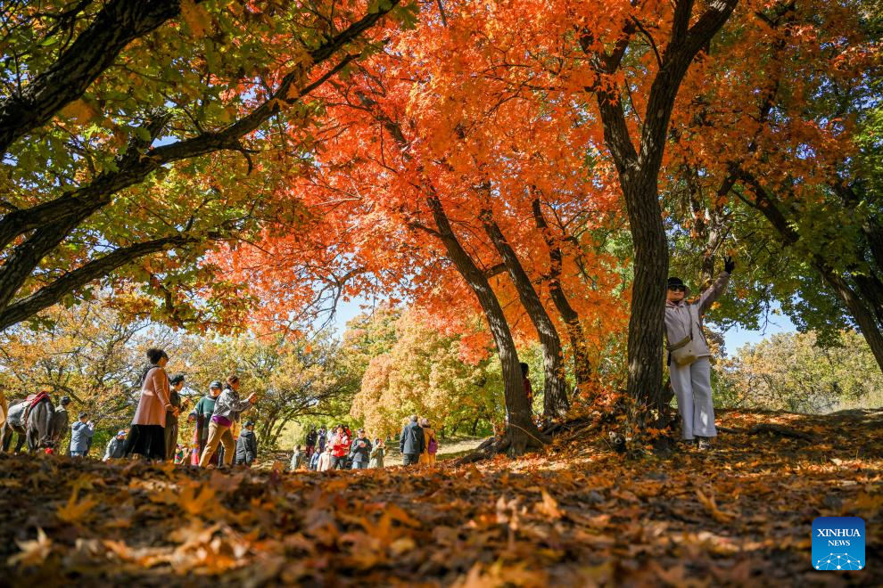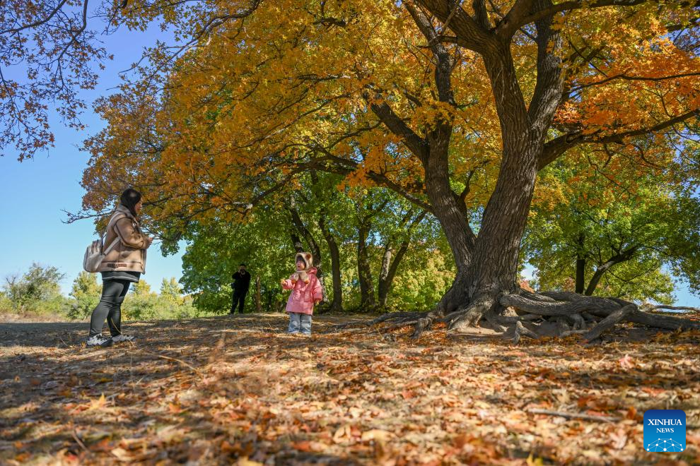 Tourists visit a forest park in Horqin Left Wing Rear Banner of Tongliao City, north China's Inner Mongolia Autonomous Region, Oct. 18, 2025. (Xinhua/Lian Zhen)