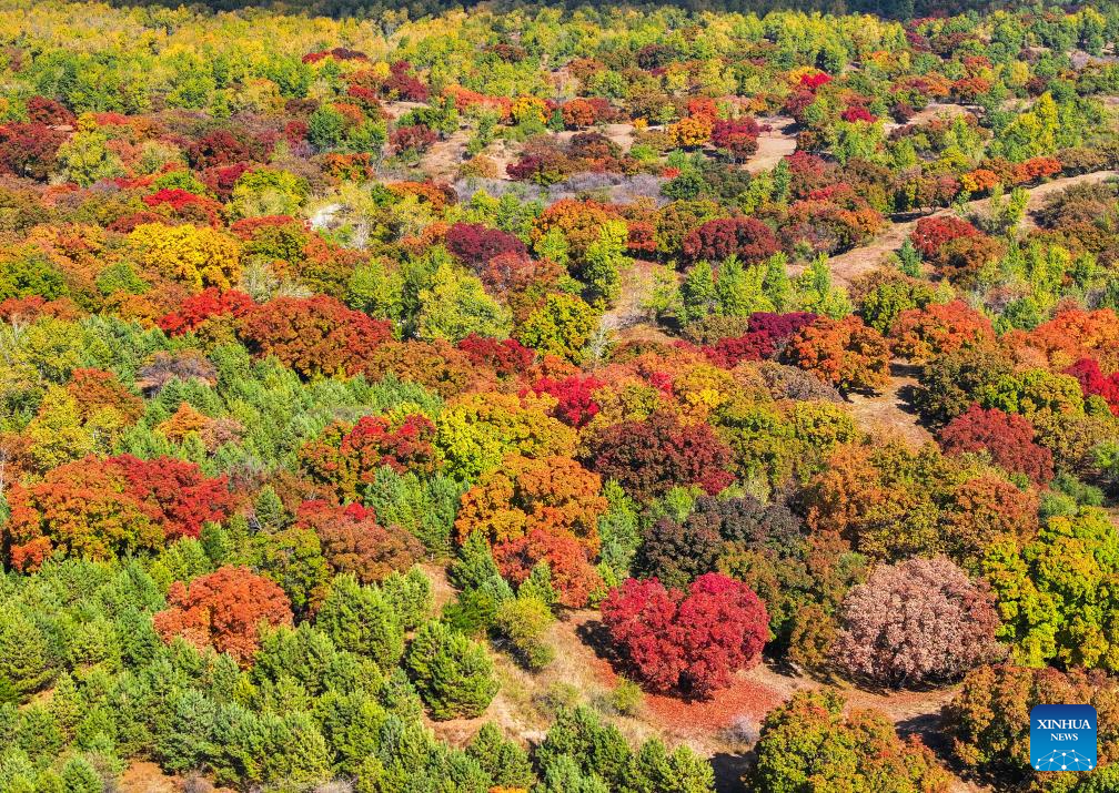 This photo taken on Oct. 18, 2025 shows the autumn scenery of a forest park in Horqin Left Wing Rear Banner of Tongliao City, north China's Inner Mongolia Autonomous Region. (Xinhua/Lian Zhen)