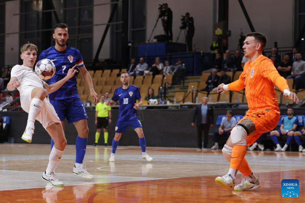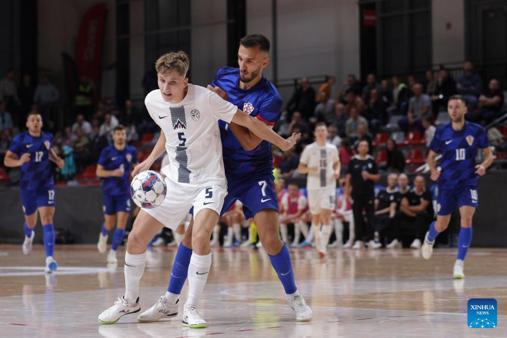 Luka Cop (front L) of Slovenia competes during a friendly match before the UEFA Futsal Euro2026 between Slovenia and Croatia in Ljubljana, Slovenia, Oct. 17, 2025. (Photo by Zeljko Stevanic/Xinhua)