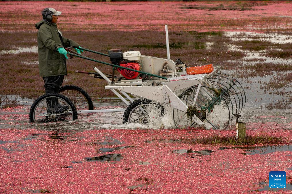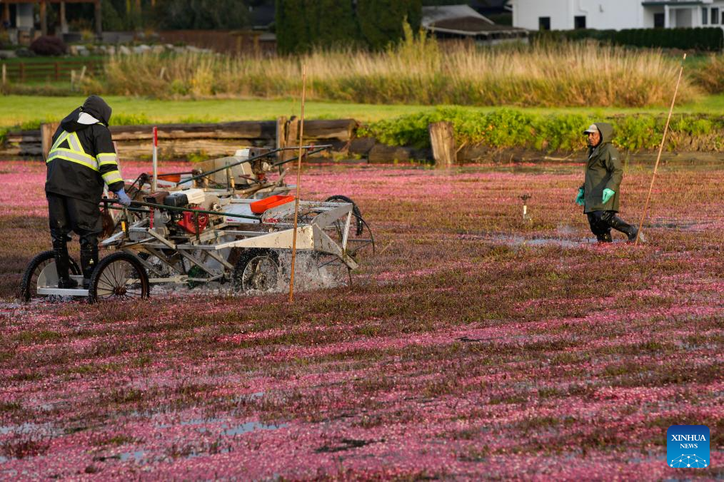 A worker harvests cranberries with a specialized machine at a cranberry farm in Richmond, British Columbia, Canada, Oct. 17, 2025. Richmond is one of the major cranberry-producing areas in Canada, where the harvest typically runs from late September to early November. (Photo by Liang Sen/Xinhua)