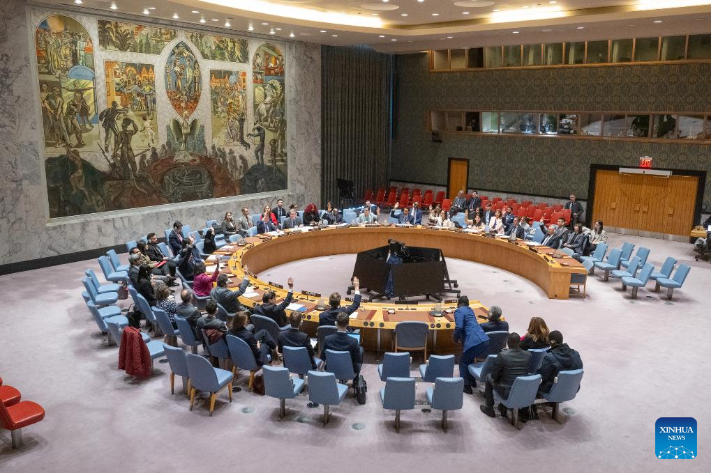 Representatives vote on a draft resolution during a Security Council meeting at the UN headquarters in New York, Oct. 17, 2025. The Security Council on Friday adopted a resolution to renew the sanctions regime on Haiti for another year. (Eskinder Debebe/UN Photo/Handout via Xinhua)