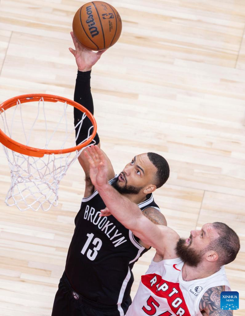 Tyrese Martin (L) of Brooklyn Nets goes up for a layup during the 2025-2026 NBA preseason game between Toronto Raptors and Brooklyn Nets in Toronto, Canada, on Oct. 17, 2025. (Photo by Zou Zheng/Xinhua)