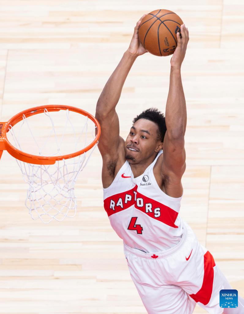 Scottie Barnes of Toronto Raptors dunks during the 2025-2026 NBA preseason game between Toronto Raptors and Brooklyn Nets in Toronto, Canada, on Oct. 17, 2025. (Photo by Zou Zheng/Xinhua)