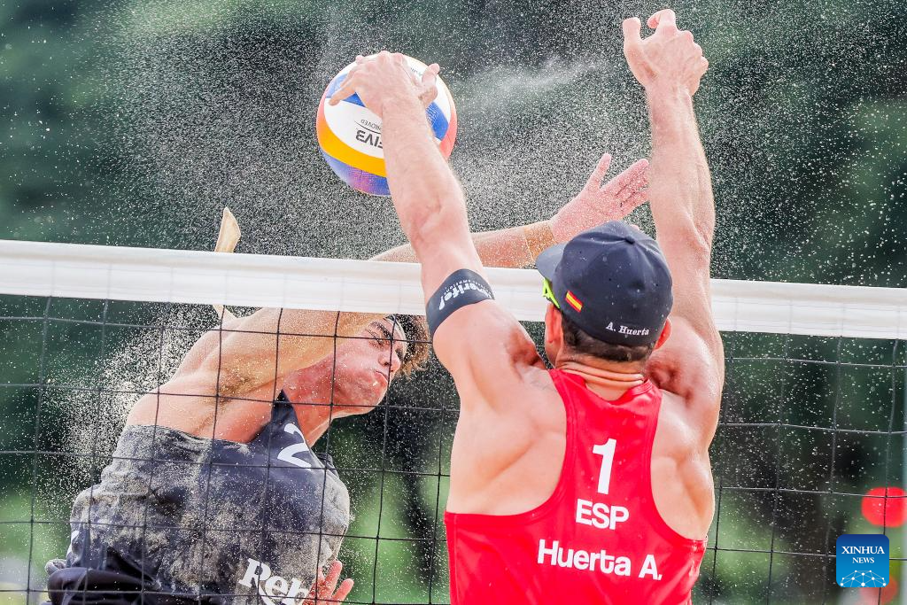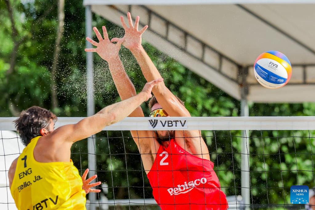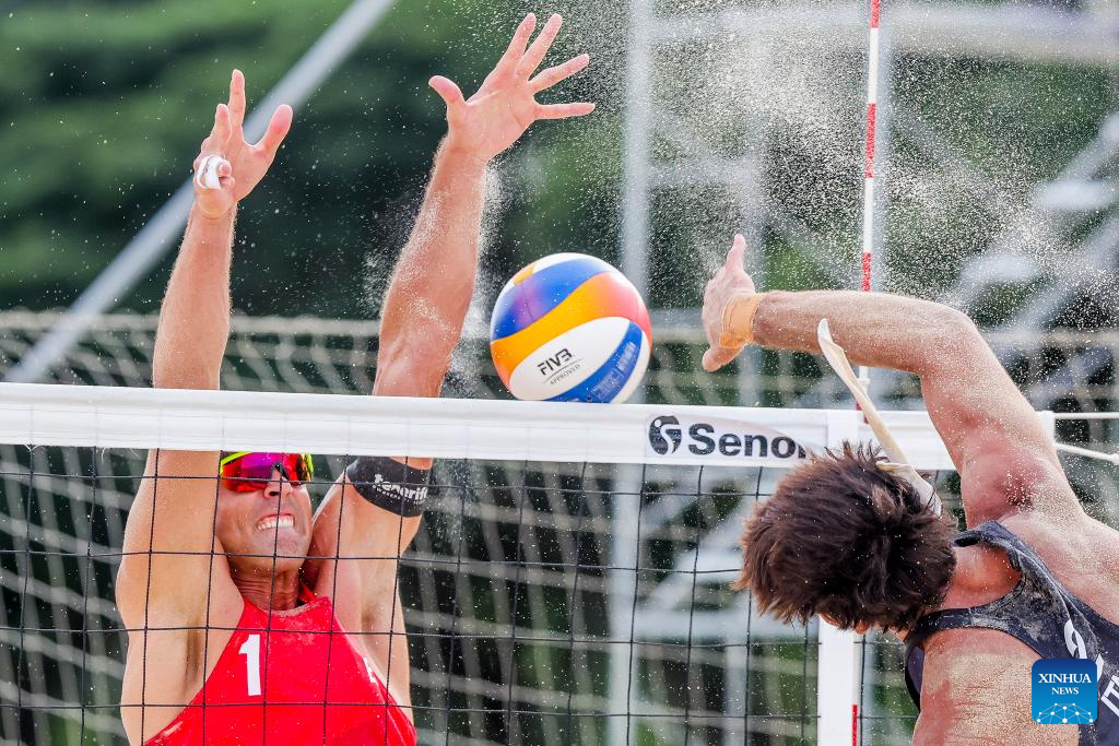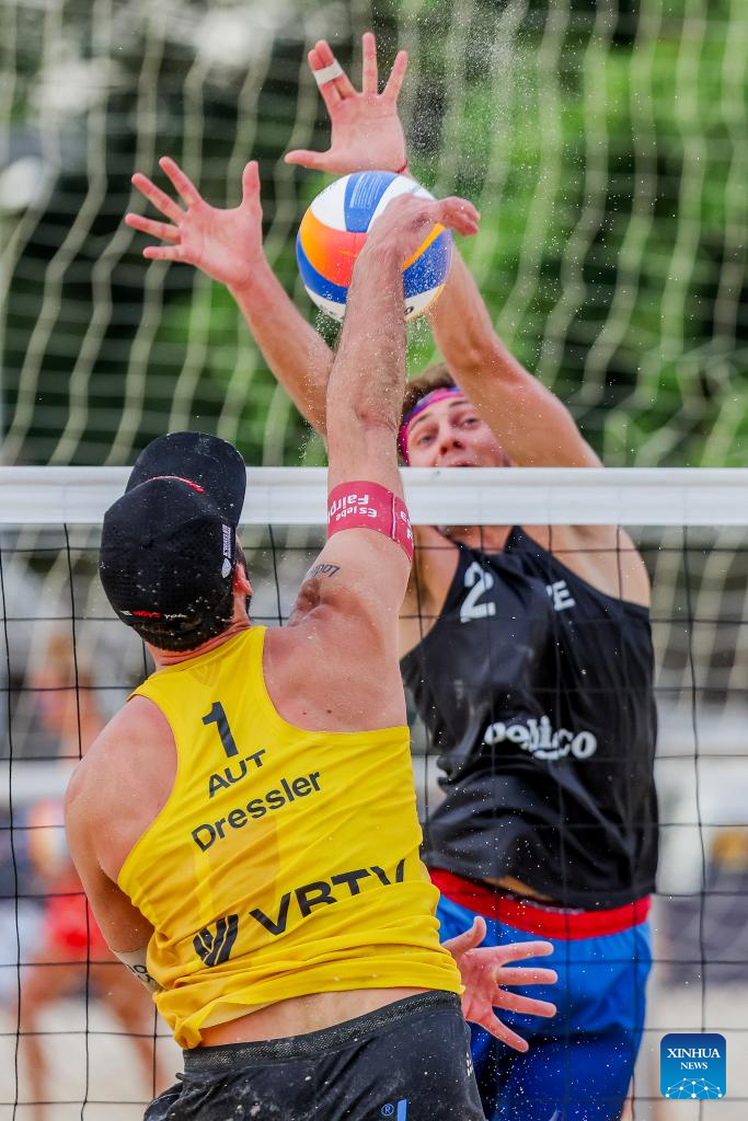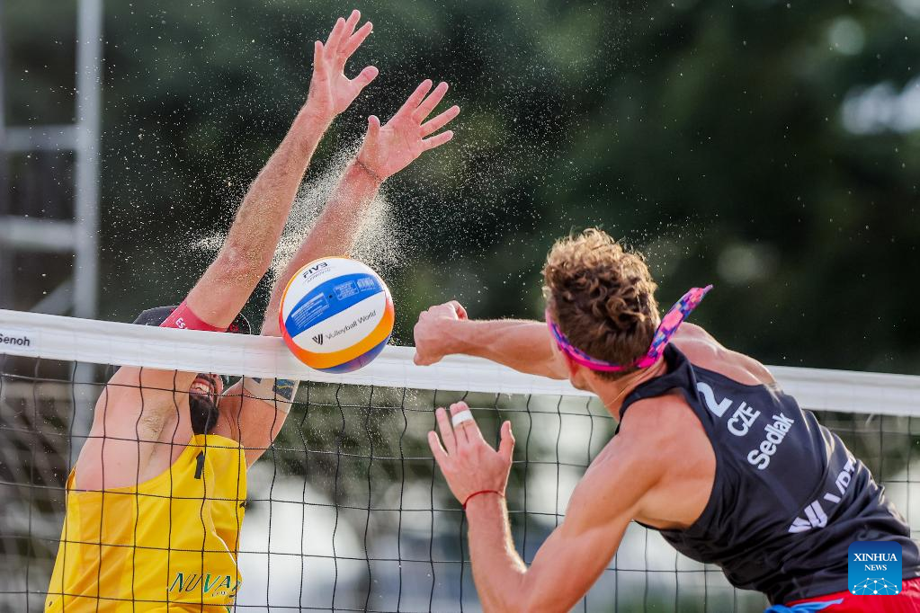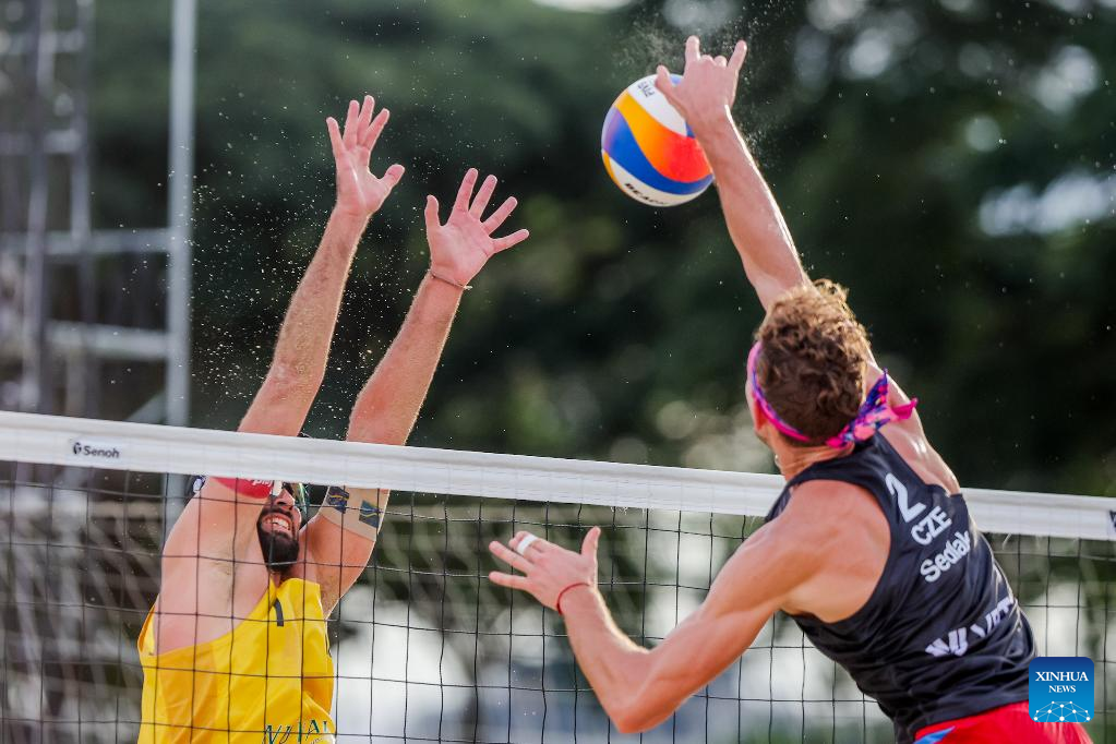 Jiri Sedlak (R) of the Czech Republic competes against Christoph Dressler of Austria during the men's quarterfinal match between Christoph Dressler/Philipp Waller of Austria and Tadeas Trousil/Jiri Sedlak of the Czech Republic at the Volleyball World Beach Pro Tour in Laguna Province, the Philippines, Oct. 18, 2025. (Xinhua/Rouelle Umali)
