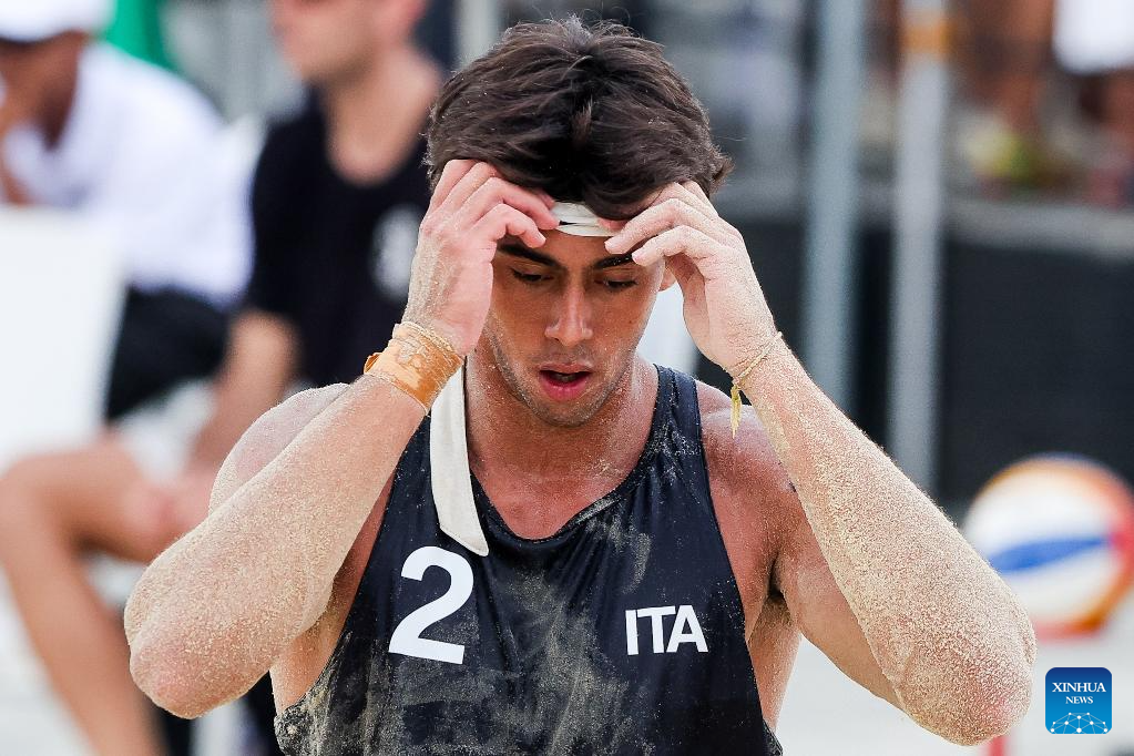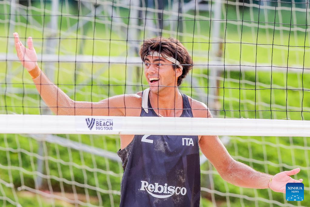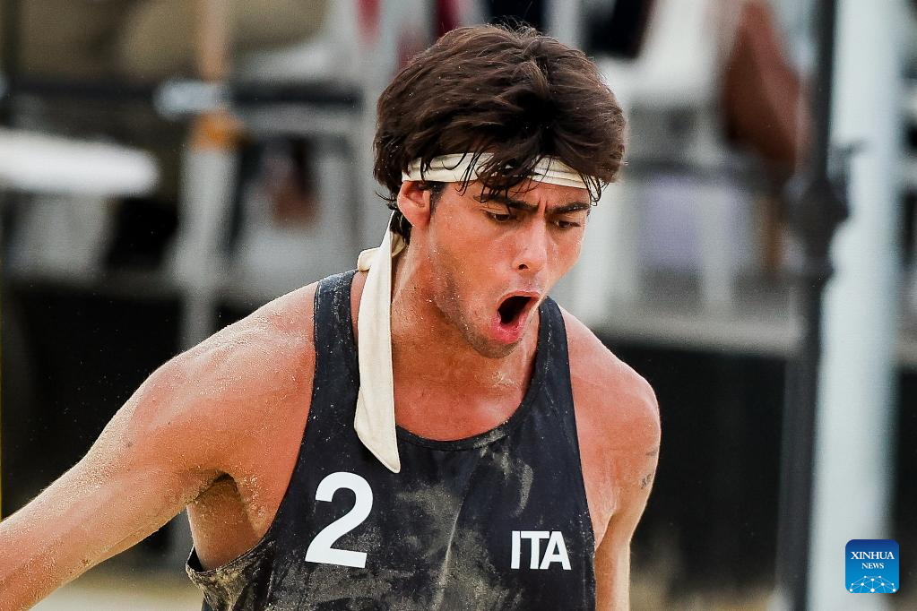 Marco Viscovich of Italy reacts after scoring a point during the men's quarterfinal match between Alejandro Huerta Pastor/Adrian Gavira Collado of Spain and Enrico Rossi/Marco Viscovich of Italy in the Volleyball World Beach Pro Tour in Laguna Province, the Philippines, on October 18, 2025. (Xinhua/Rouelle Umali)
