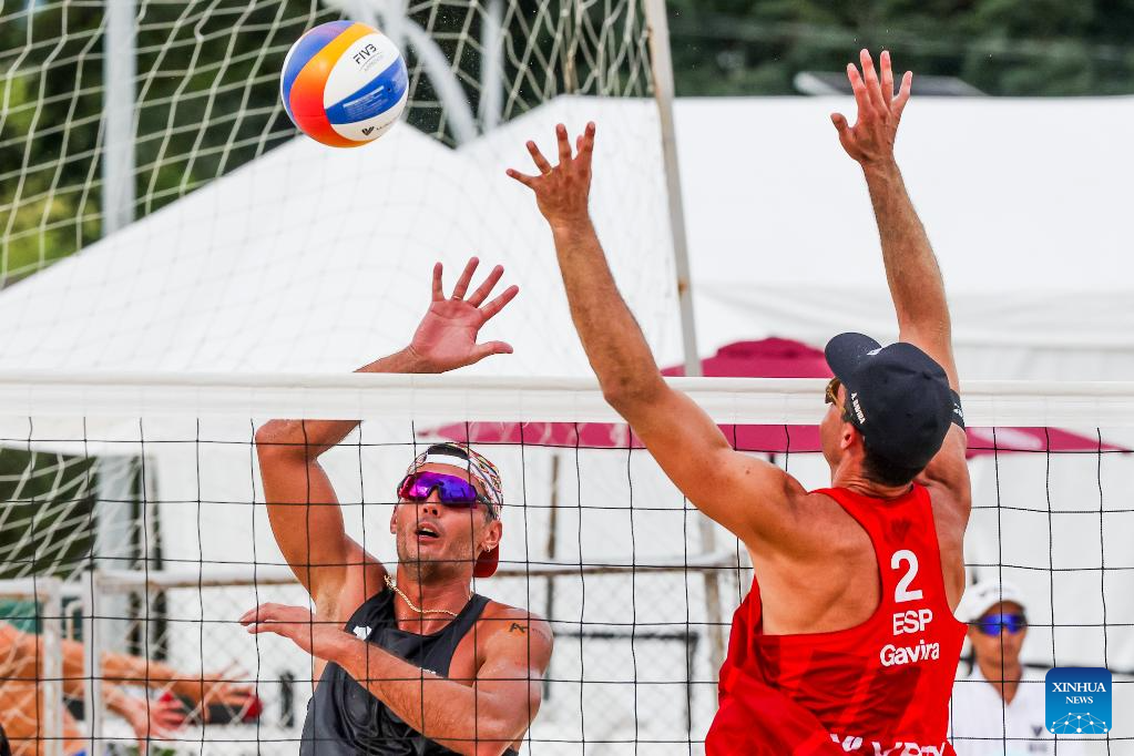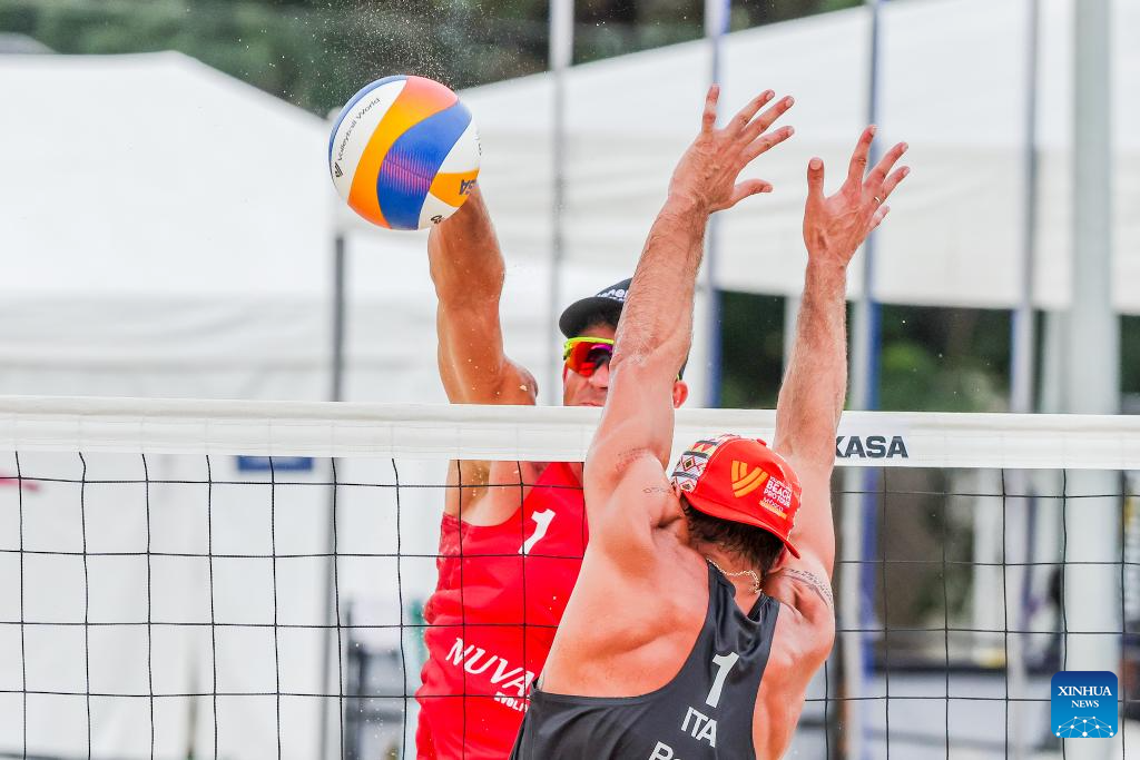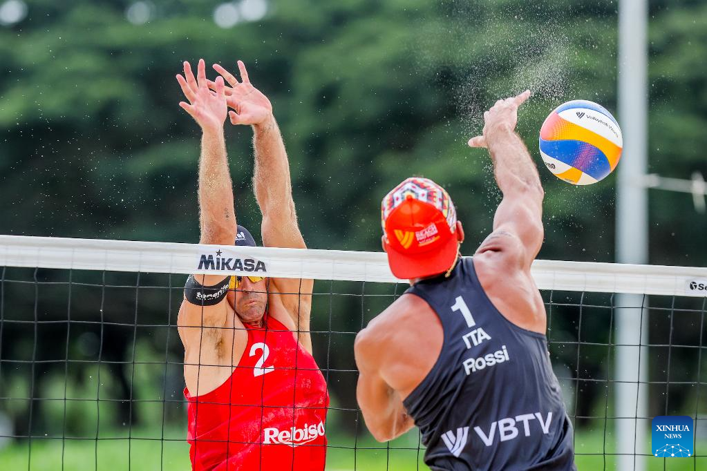 Enrico Rossi (L) of Italy competes against Adrian Gavira Collado of Spain during the men's quarterfinal match between Alejandro Huerta Pastor/Adrian Gavira Collado of Spain and Enrico Rossi/Marco Viscovich of Italy in the Volleyball World Beach Pro Tour in Laguna Province, the Philippines, on October 18, 2025. (Xinhua/Rouelle Umali)