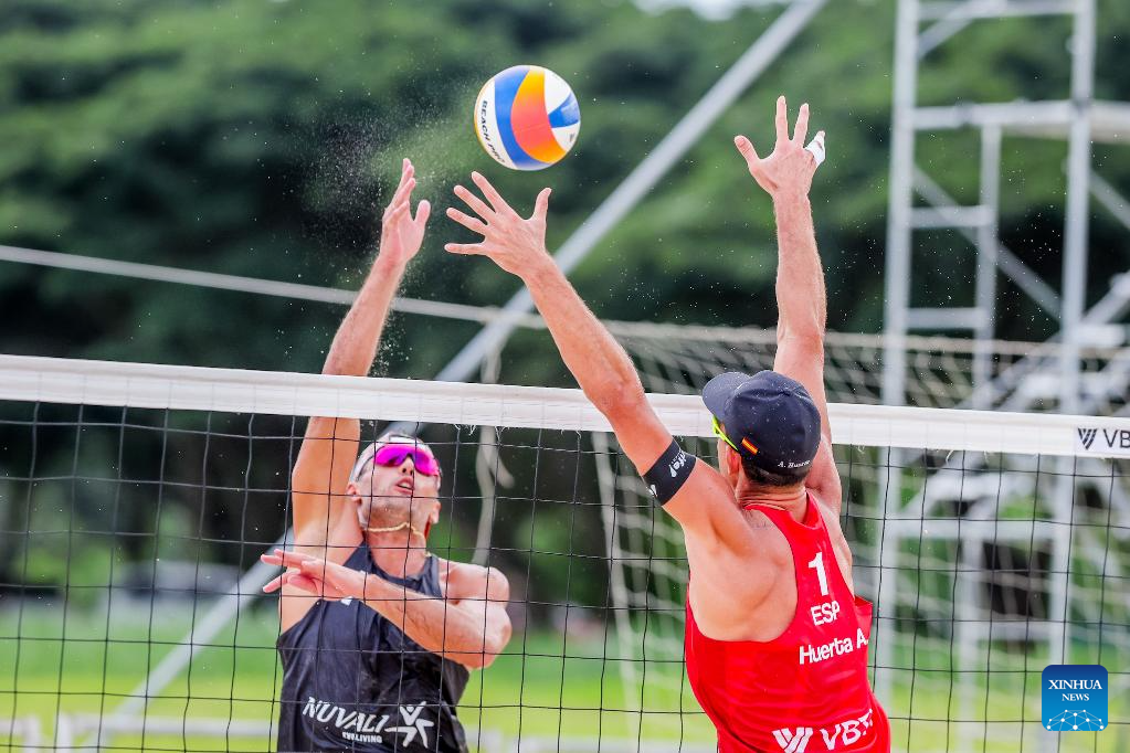 Enrico Rossi (L) of Italy competes against Alejandro Huerta Pastor of Spain during the men's quarterfinal match between Alejandro Huerta Pastor/Adrian Gavira Collado of Spain and Enrico Rossi/Marco Viscovich of Italy in the Volleyball World Beach Pro Tour in Laguna Province, the Philippines, on October 18, 2025. (Xinhua/Rouelle Umali)