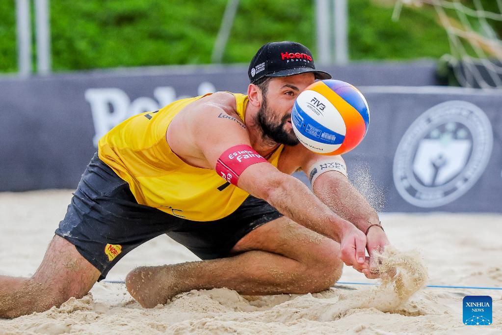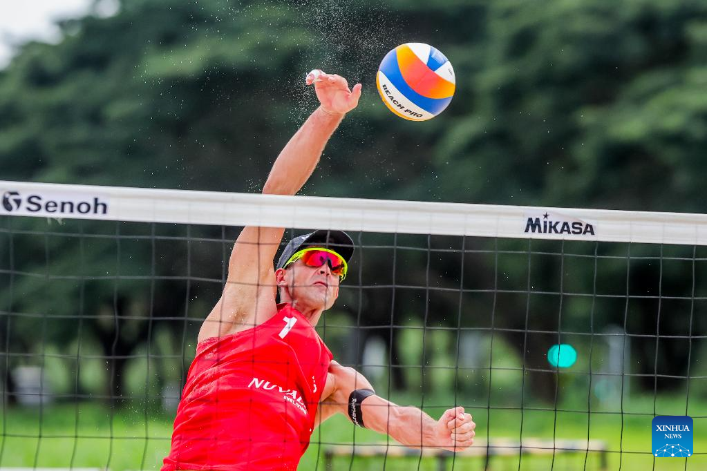 Christoph Dressler of Austria competes during the men's quarterfinal match between Christoph Dressler/Philipp Waller of Austria and Tadeas Trousil/Jiri Sedlak of the Czech Republic at the Volleyball World Beach Pro Tour in Laguna Province, the Philippines, Oct. 18, 2025. (Xinhua/Rouelle Umali)