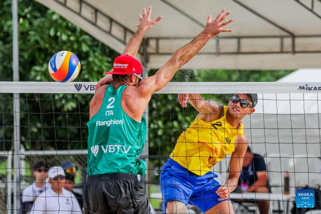 Sofyan Rachman Efendi (back) of Indonesia competes against Alex Ranghieri of Italy during the men's quarterfinal match between Manuel Alfieri/Alex Ranghieri of Italy and Bintang Akbar/Sofyan Rachman Efendi of Indonesia at the Volleyball World Beach Pro Tour in Laguna Province, the Philippines, Oct. 18, 2025. (Xinhua/Rouelle Umali)