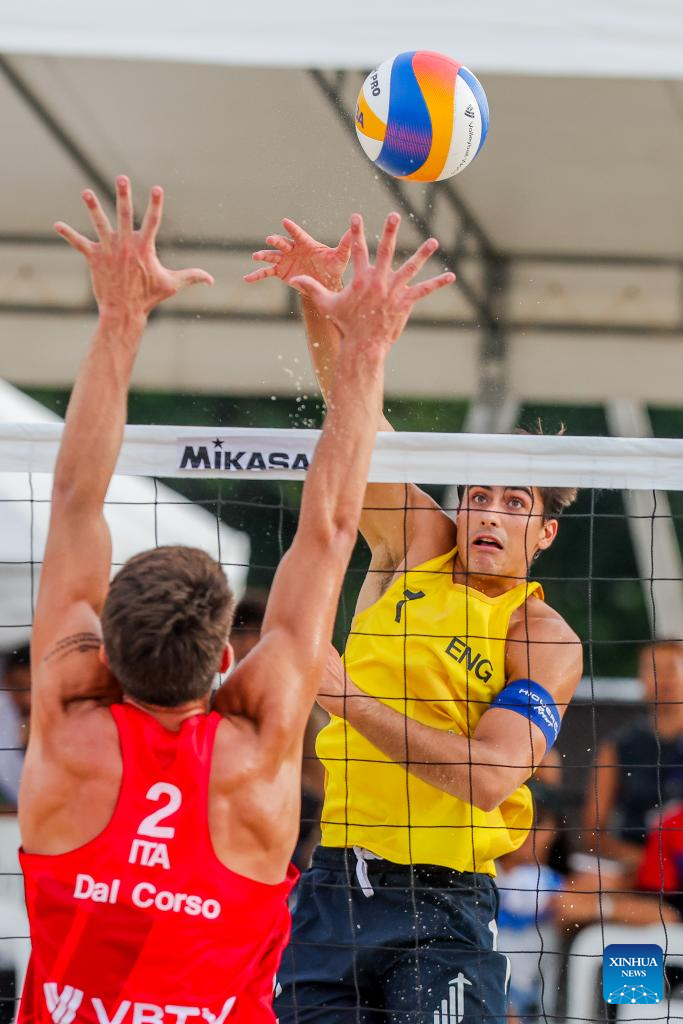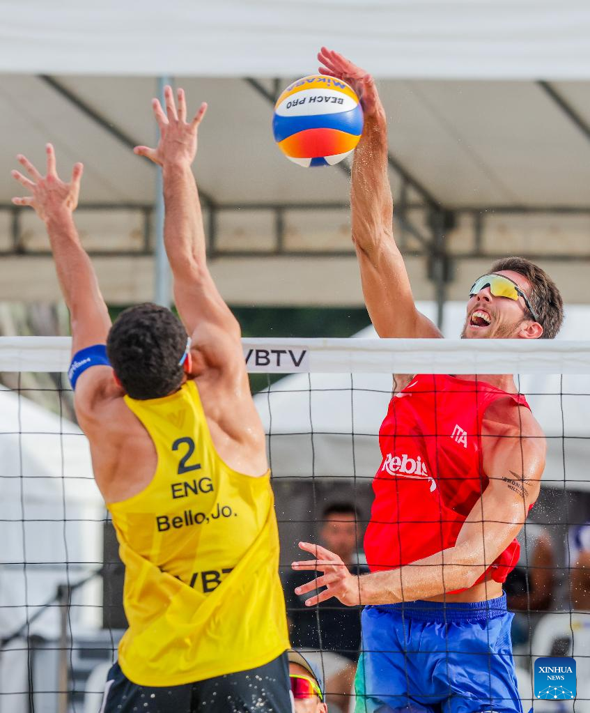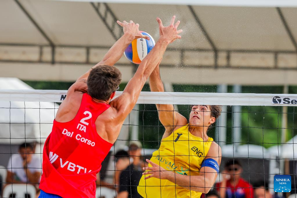 Joaquin Bello (L) of England competes against Gianluca Dal Corso of Italy during the men's quarterfinal match between Javier Bello/Joaquin Bello of England and Samuele Cottafava/Gianluca Dal Corso of Italy at the Volleyball World Beach Pro Tour in Laguna Province, the Philippines, Oct. 18, 2025. (Xinhua/Rouelle Umali)