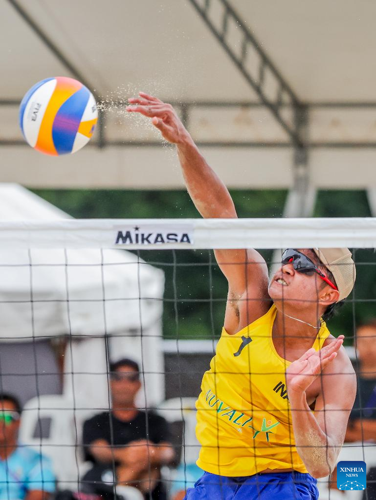 Bintang Akbar of Indonesia competes during the men's quarterfinal match between Manuel Alfieri/Alex Ranghieri of Italy and Bintang Akbar/Sofyan Rachman Efendi of Indonesia at the Volleyball World Beach Pro Tour in Laguna Province, the Philippines, Oct. 18, 2025. (Xinhua/Rouelle Umali)