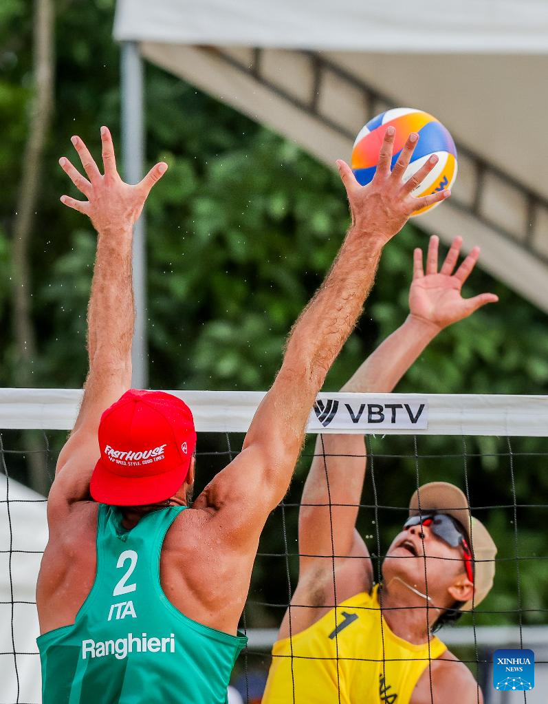 Bintang Akbar (back) of Indonesia competes against Alex Ranghieri of Italy during the men's quarterfinal match between Manuel Alfieri/Alex Ranghieri of Italy and Bintang Akbar/Sofyan Rachman Efendi of Indonesia at the Volleyball World Beach Pro Tour in Laguna Province, the Philippines, Oct. 18, 2025. (Xinhua/Rouelle Umali)