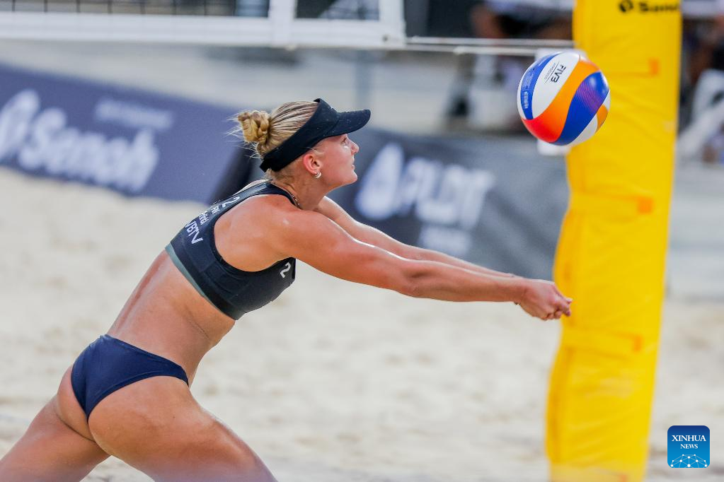 Aine Raupelyte of Lithuania competes during the women's quarterfinal match between Anniina Parkkinen/Valma Vilhelmiina Prihti of Finland and Monika Paulikiene/Aine Raupelyte of Lithuania at the Volleyball World Beach Pro Tour in Laguna Province, the Philippines, Oct. 18, 2025. (Xinhua/Rouelle Umali)