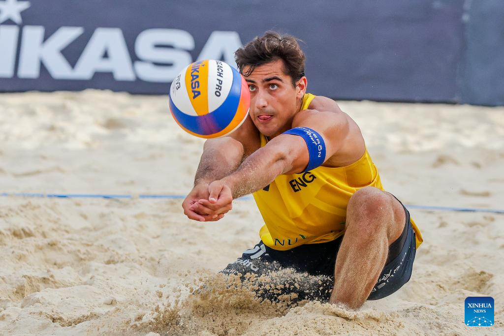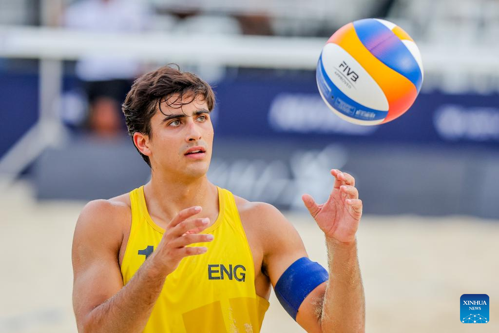 Javier Bello of England competes during the men's quarterfinal match between Javier Bello/Joaquin Bello of England and Samuele Cottafava/Gianluca Dal Corso of Italy at the Volleyball World Beach Pro Tour in Laguna Province, the Philippines, Oct. 18, 2025. (Xinhua/Rouelle Umali)
