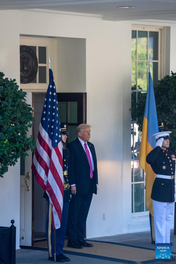 U.S. President Donald Trump (2nd L) waits to welcome Ukrainian President Volodymyr Zelensky at the White House in Washington, D.C., the United States, Oct 17, 2025. (Xinhua/Hu Yousong)