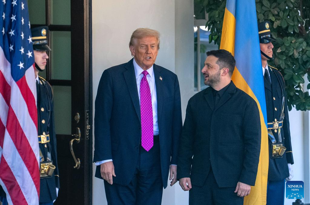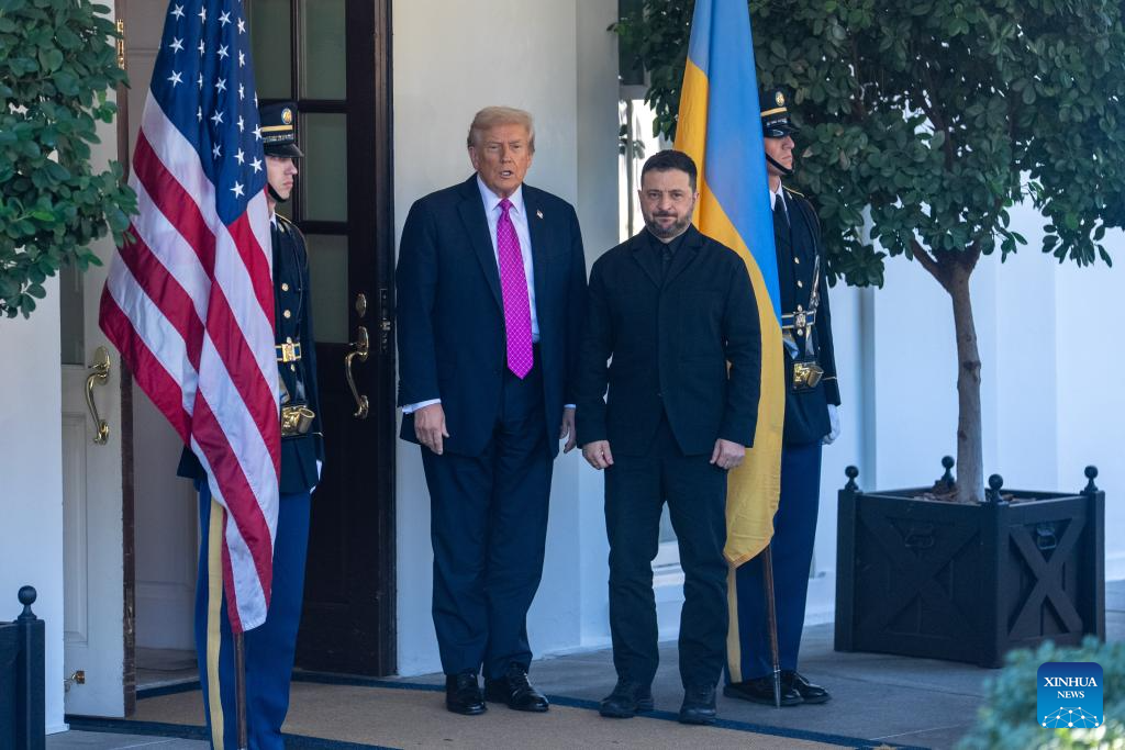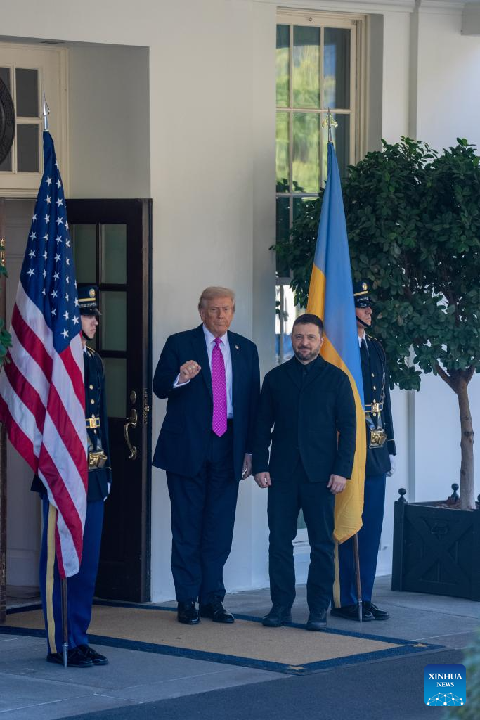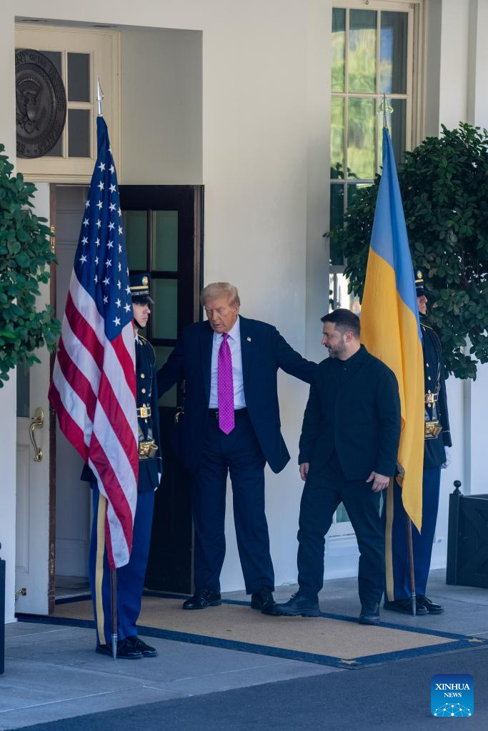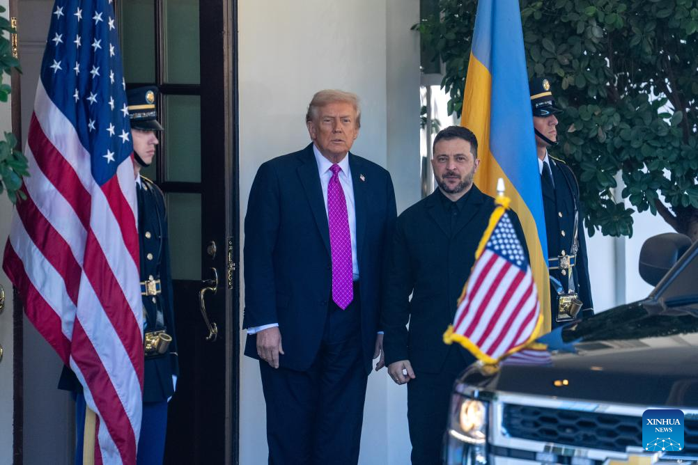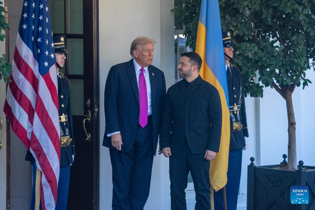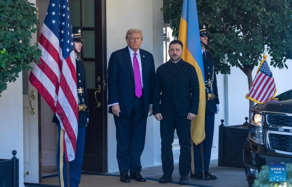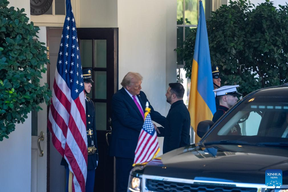 U.S. President Donald Trump (2nd L) welcomes Ukrainian President Volodymyr Zelensky at the White House in Washington, D.C., the United States, Oct 17, 2025. (Xinhua/Hu Yousong)
