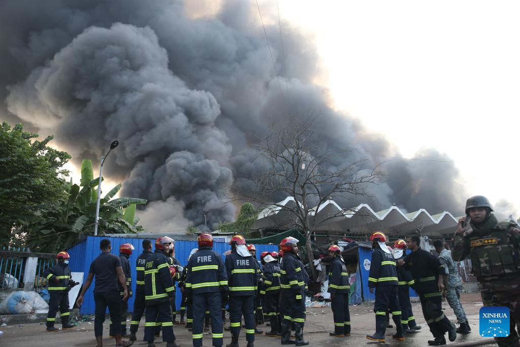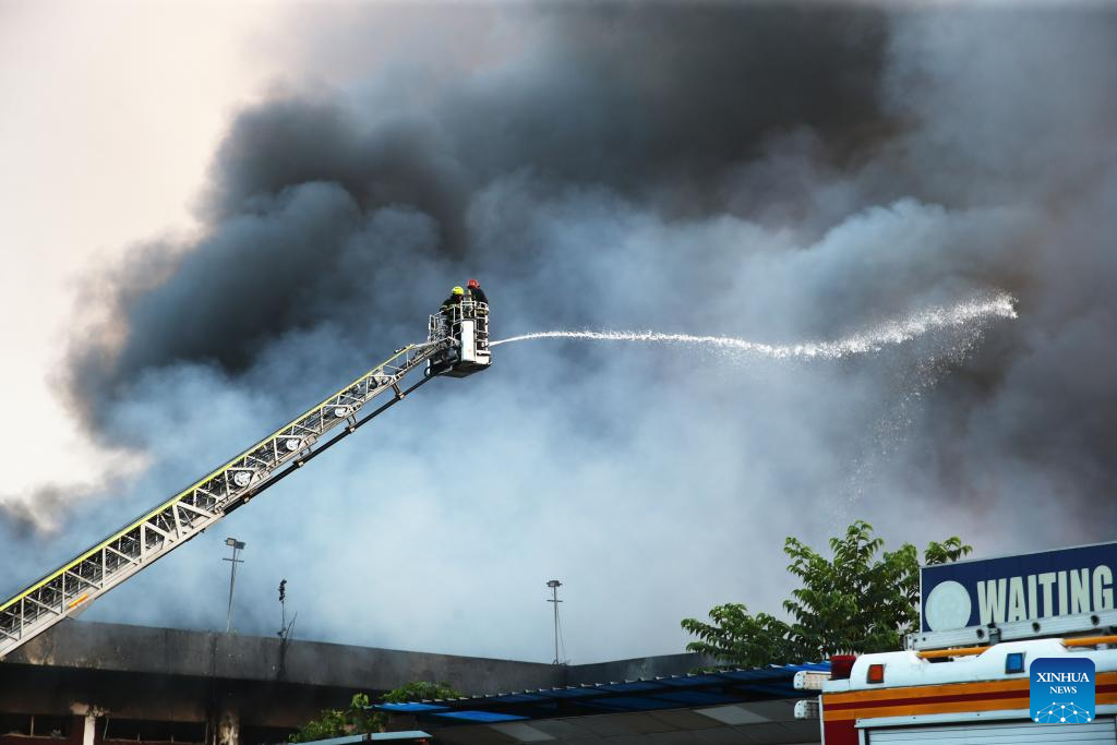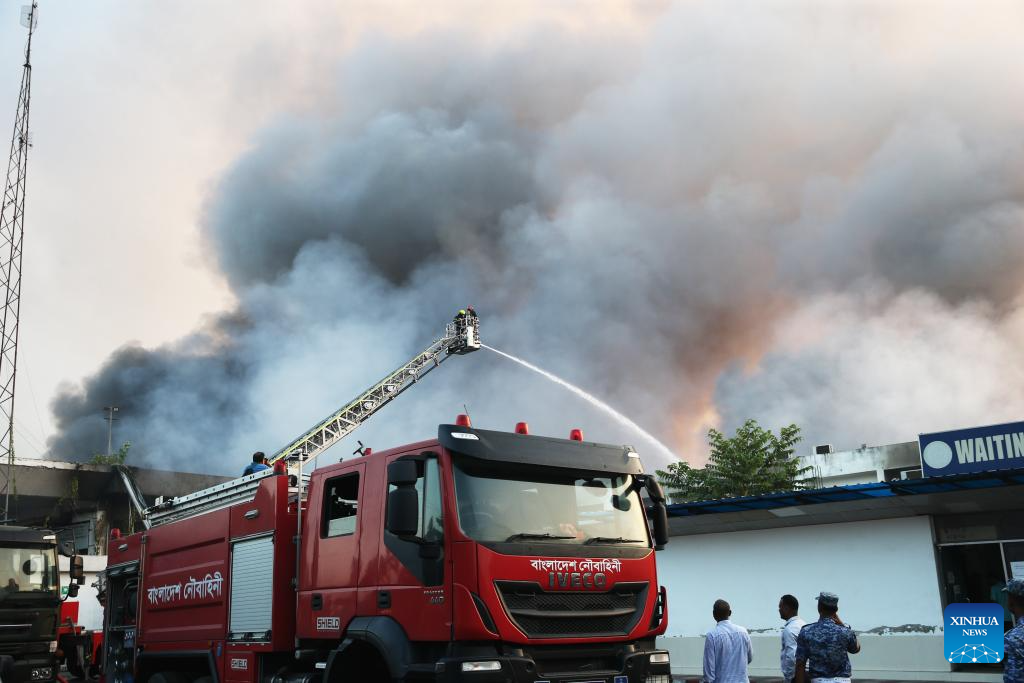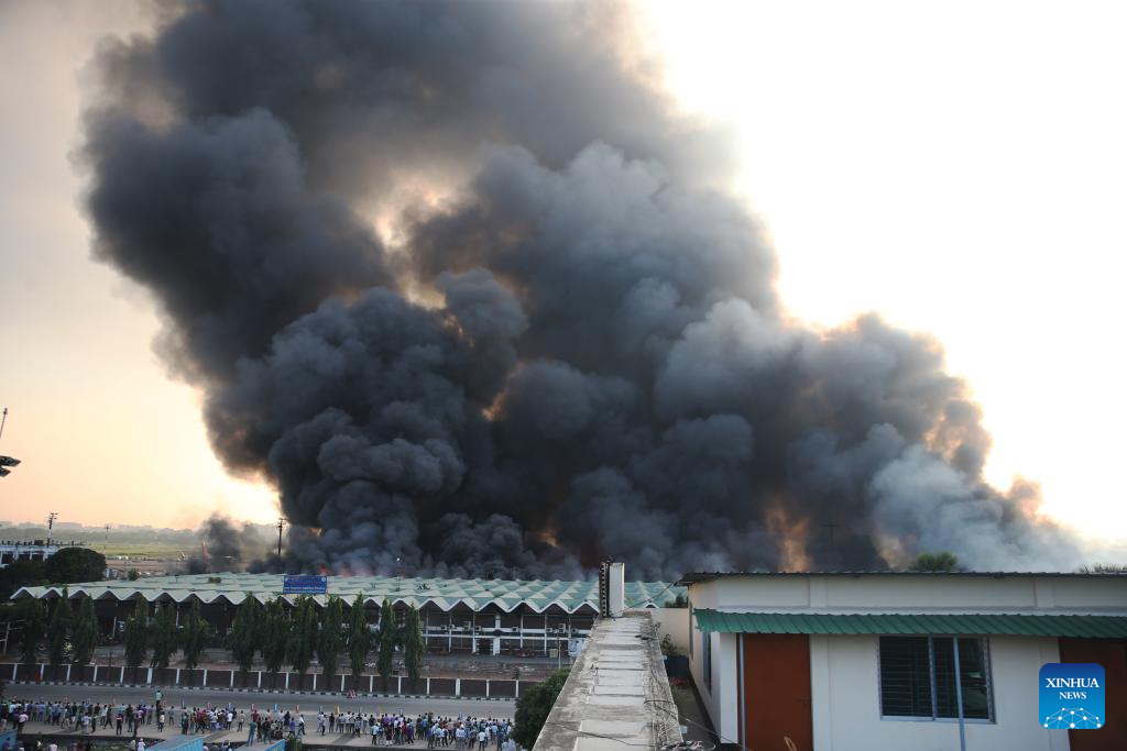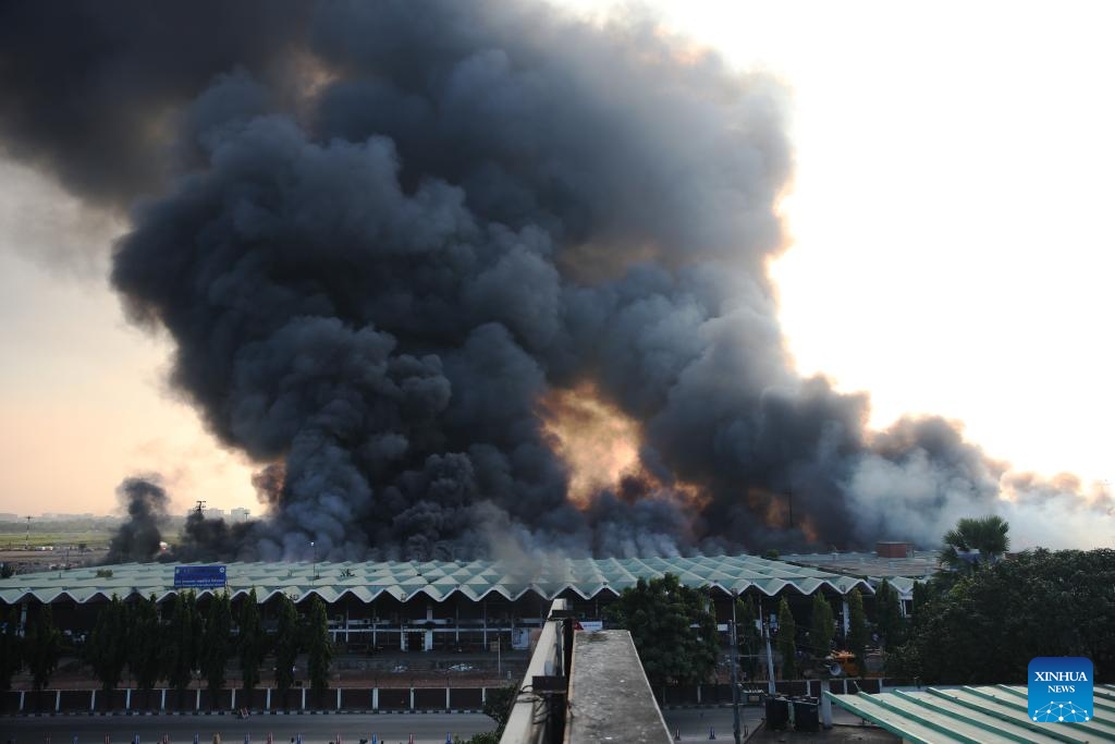 DHAKA, Oct. 18 (Xinhua) -- A massive fire broke out in the cargo area of Hazrat Shahjalal International Airport in Bangladesh's capital Dhaka Saturday, forcing a temporary suspension of flight operations.