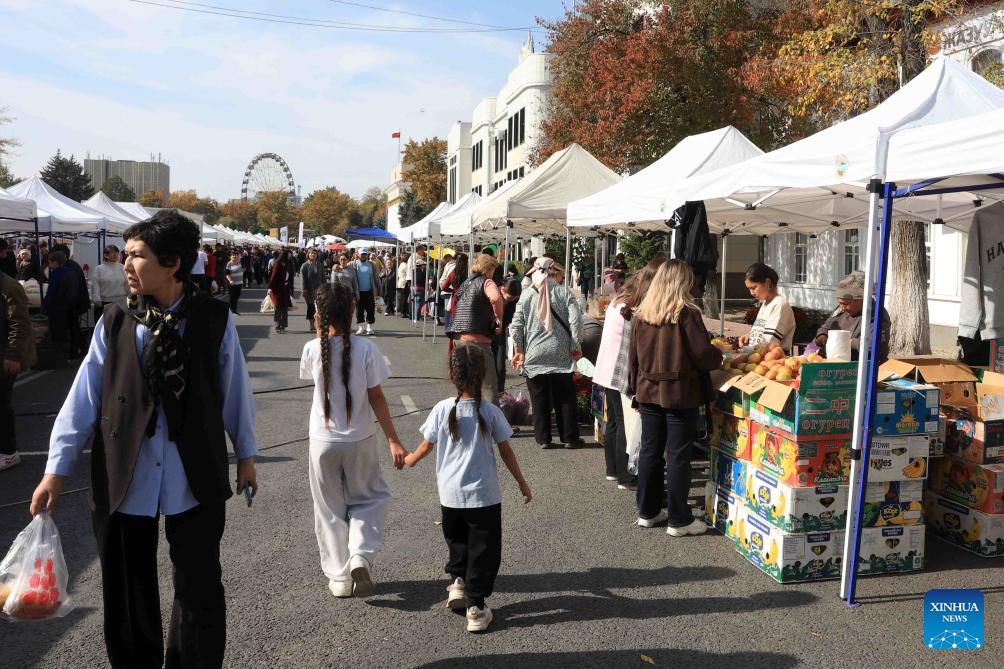 People visit an agro-industrial exhibition and agricultural fair in Bishkek, Kyrgyzstan, Oct. 17, 2025. A three-day agro-industrial exhibition and agricultural fair opened here on Friday, bringing together exhibitors from various regions of the country. It aims to showcase Kyrgyzstan's agricultural development achievements and strengthen agricultural exchanges and cooperation among regions. (Photo by Roman/Xinhua)