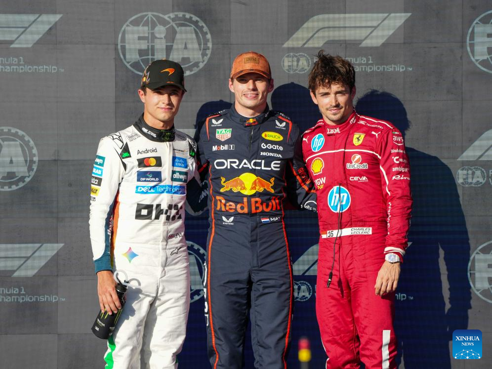 First-placed Red Bull's Dutch driver Max Verstappen (C), second-placed McLaren's British driver Lando Norris (L) and third-placed Ferrari's Monegasque driver Charles Leclerc pose after the qualifying session for the Formula One United States Grand Prix, in Austin, Texas, the United States, Oct. 18, 2025. (Photo by Xu Mingnan/Xinhua)