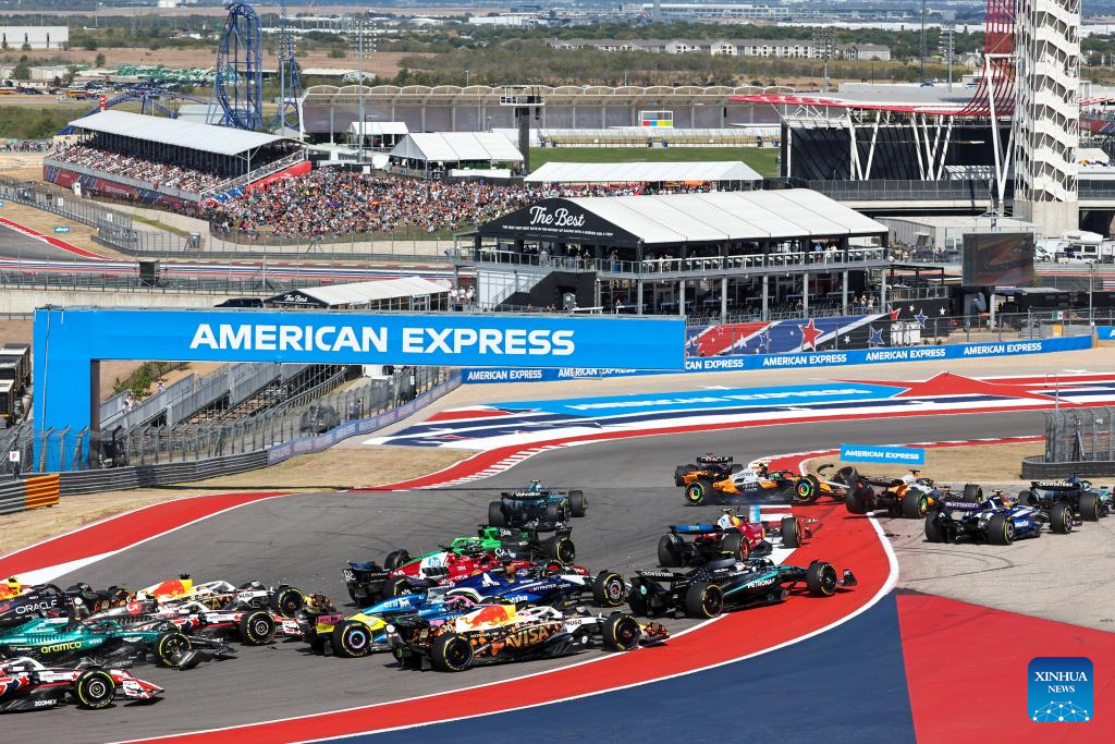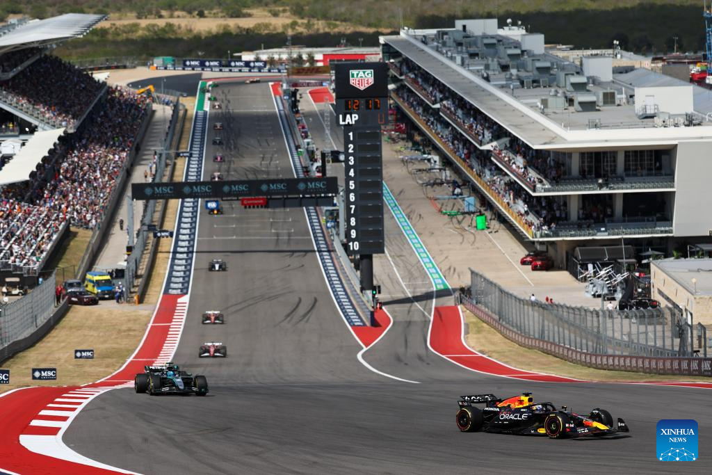 Red Bull's Dutch driver Max Verstappen (1st R) competes during the Sprint race of the Formula One United States Grand Prix, in Austin, Texas, the United States, Oct. 18, 2025. (Photo by Song Haiyuan/Xinhua)