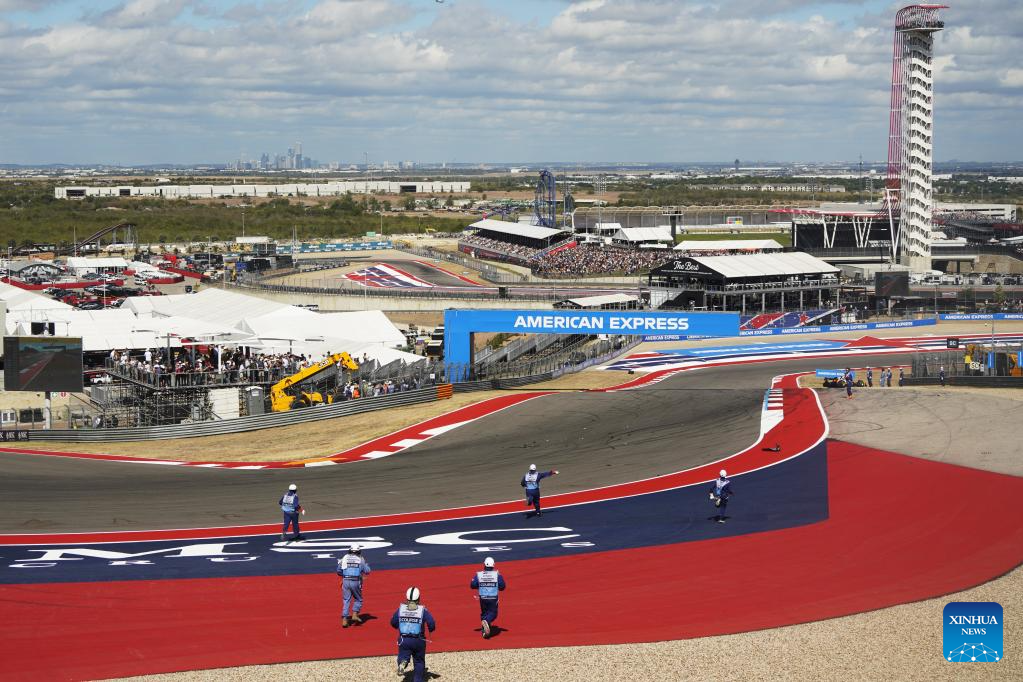 Marshals run to the track after a crash during the Sprint race of the Formula One United States Grand Prix, in Austin, Texas, the United States, Oct. 18, 2025. (Xinhua/Wu Xiaoling)