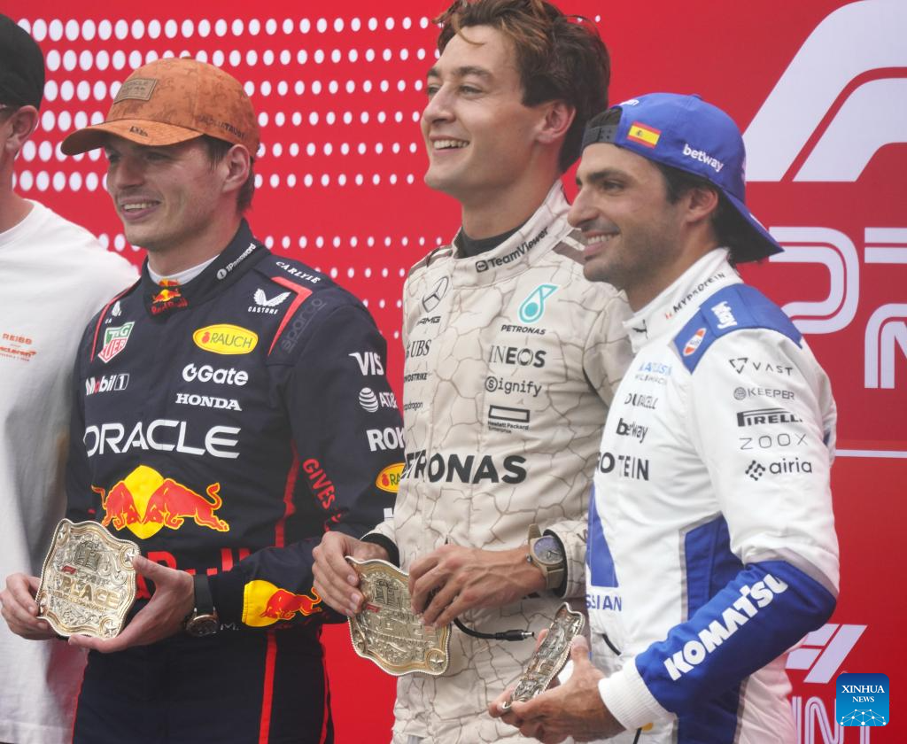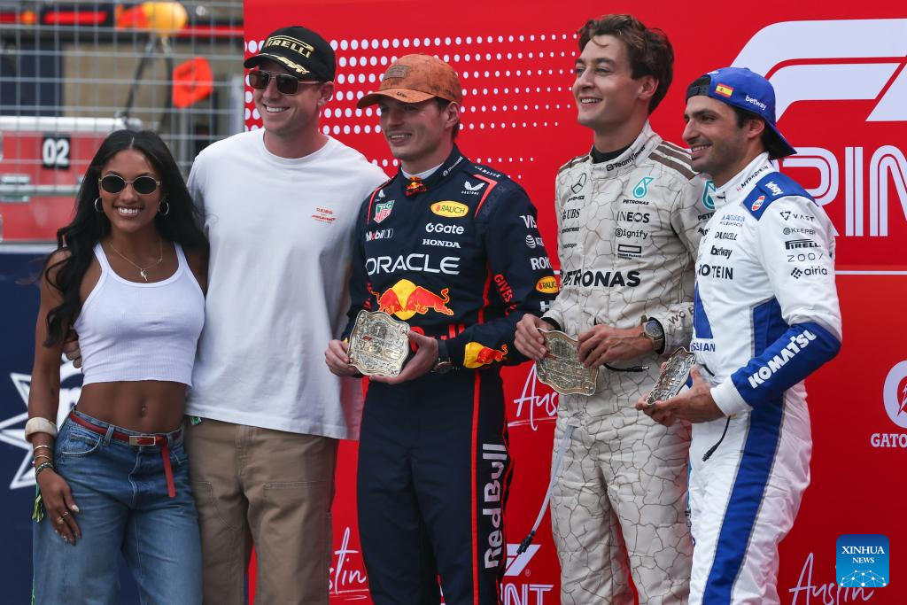 First-placed Red Bull's Dutch driver Max Verstappen (L), second-placed Mercedes' British driver George Russell (C) and third-placed Williams' Spanish driver Carlos Sainz pose after the Sprint race of the Formula One United States Grand Prix, in Austin, Texas, the United States, Oct. 18, 2025. (Xinhua/Wu Xiaoling)