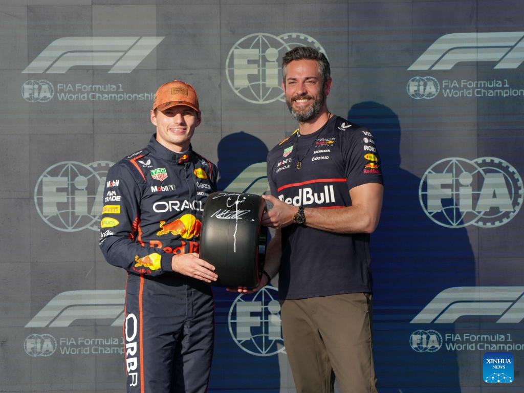 Red Bull's Dutch driver Max Verstappen (L), winner of the pole position, poses with the trophy after the qualifying session for the Formula One United States Grand Prix, in Austin, Texas, the United States, Oct. 18, 2025. (Photo by Xu Mingnan/Xinhua)
