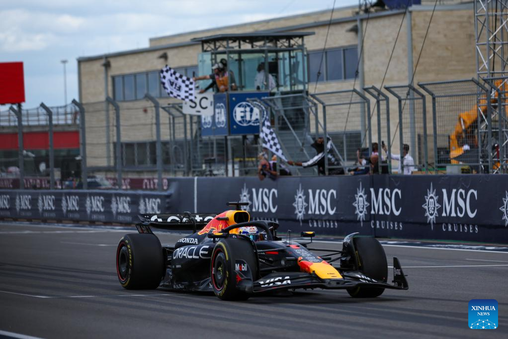 Red Bull's Dutch driver Max Verstappen crosses the finish line during the Sprint race of the Formula One United States Grand Prix, in Austin, Texas, the United States, Oct. 18, 2025. (Photo by Song Haiyuan/Xinhua)