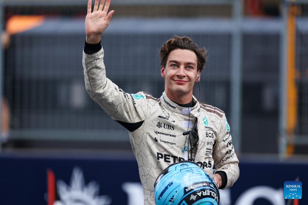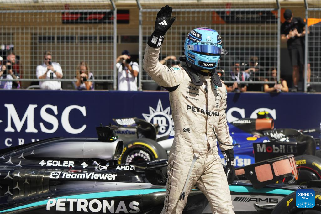Mercedes' British driver George Russell waves to the spectators after the Sprint race of the Formula One United States Grand Prix, in Austin, Texas, the United States, Oct. 18, 2025. (Xinhua/Wu Xiaoling)